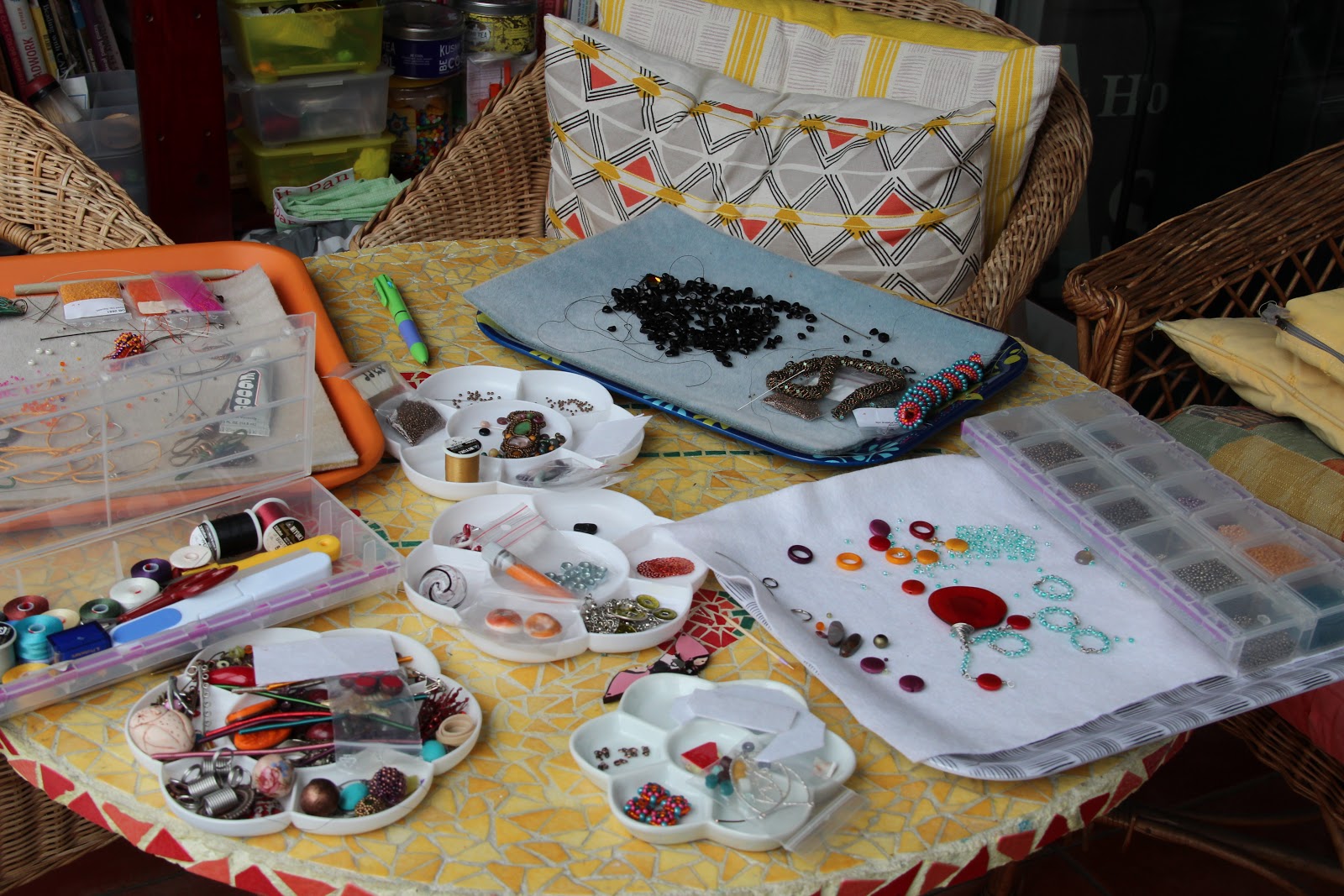 I started working on an embroidered pendant and it has to share space on a tray!