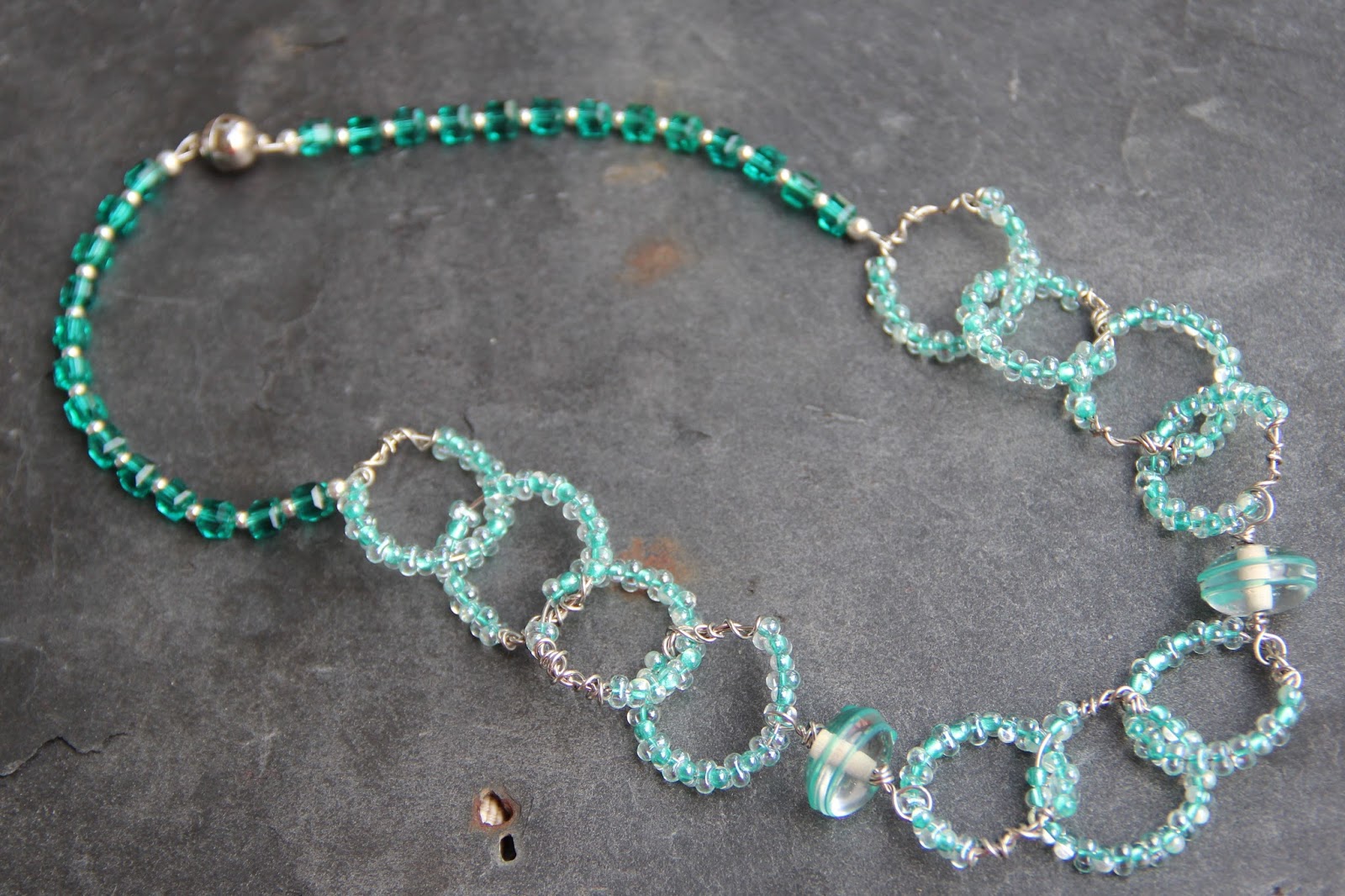 | Maillons en fil de métal et perles « peanut » (cacahuete), perles de verre, cristal Wireworked beaded links with peanut beads, glass beads, crystal |