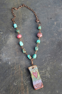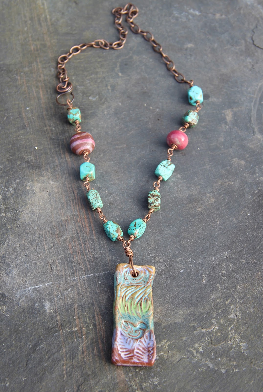 The other wire worked, with turquoise stones, ceramic beads and a colorful, reversible ceramic pendant.