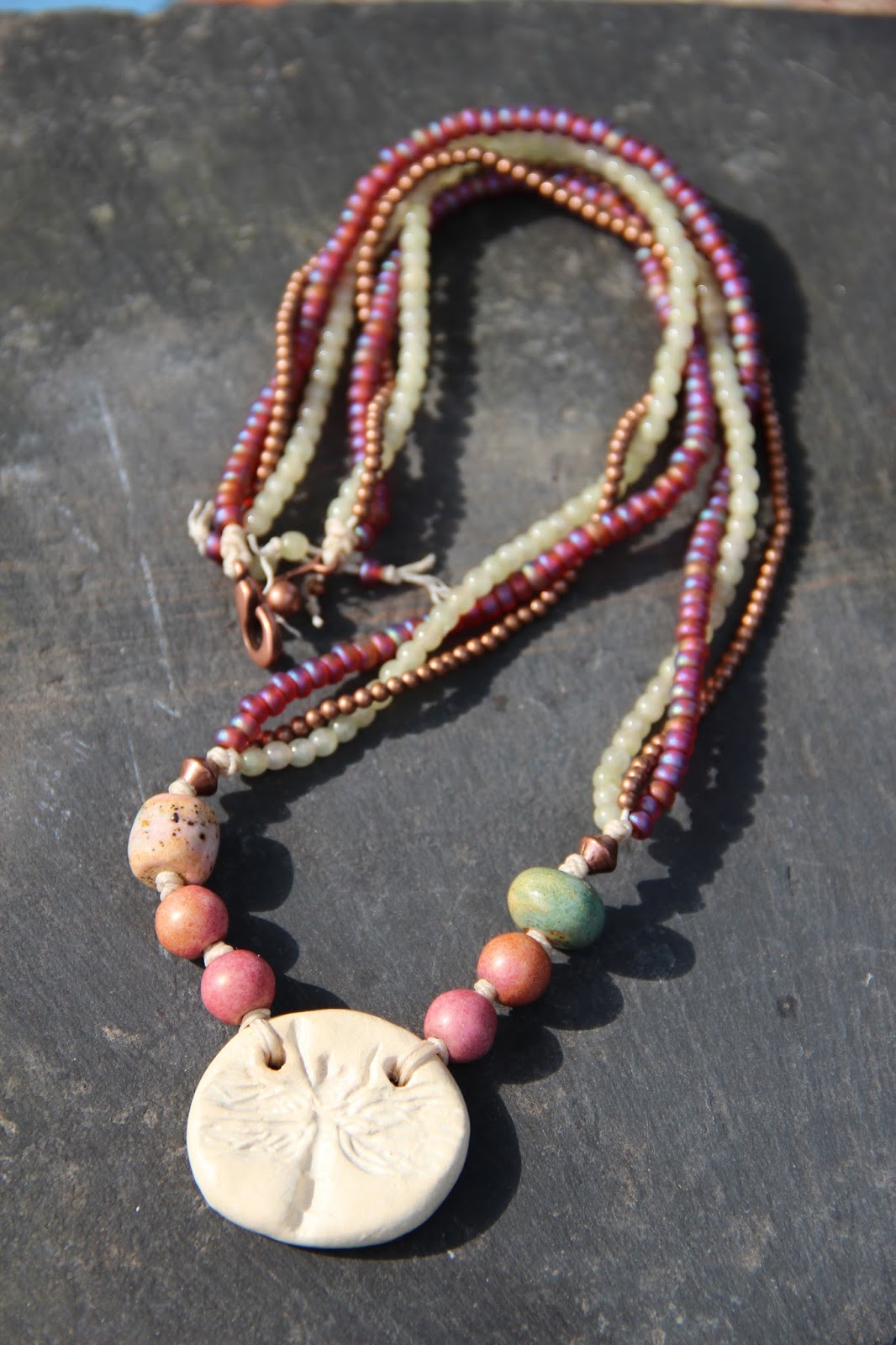 One, multistrand, made with stone beads, ceramic beads and a ceramic dragonfly pendant strung on linen cord.