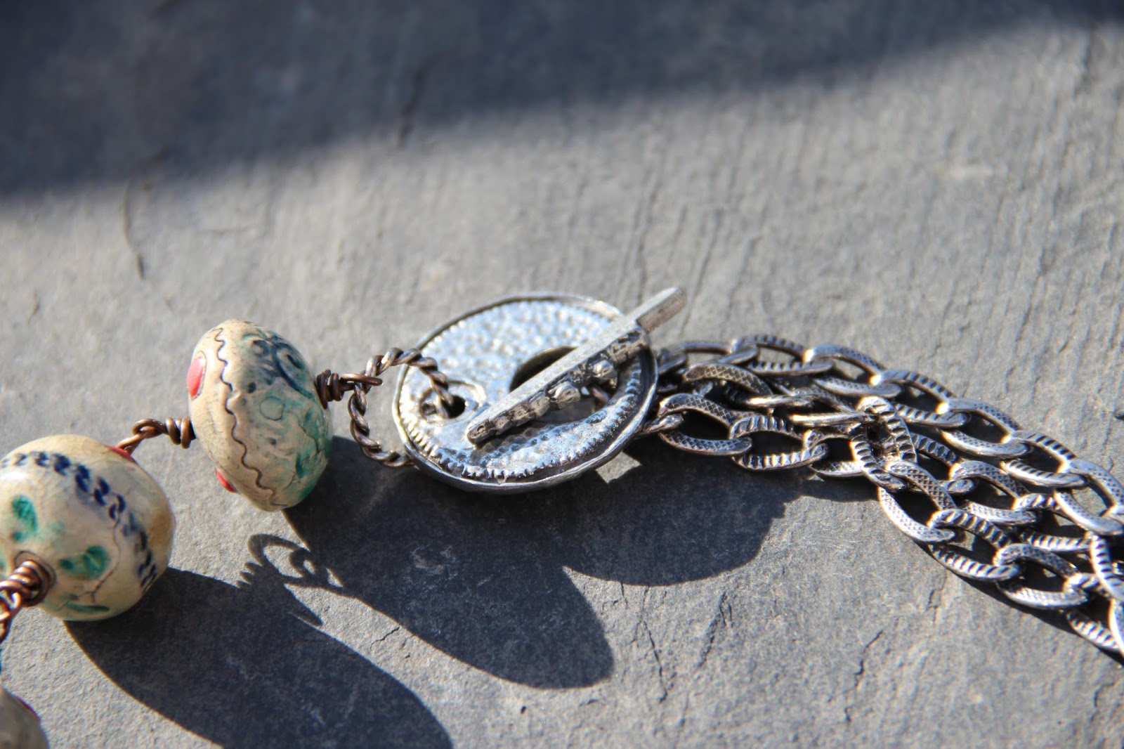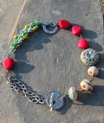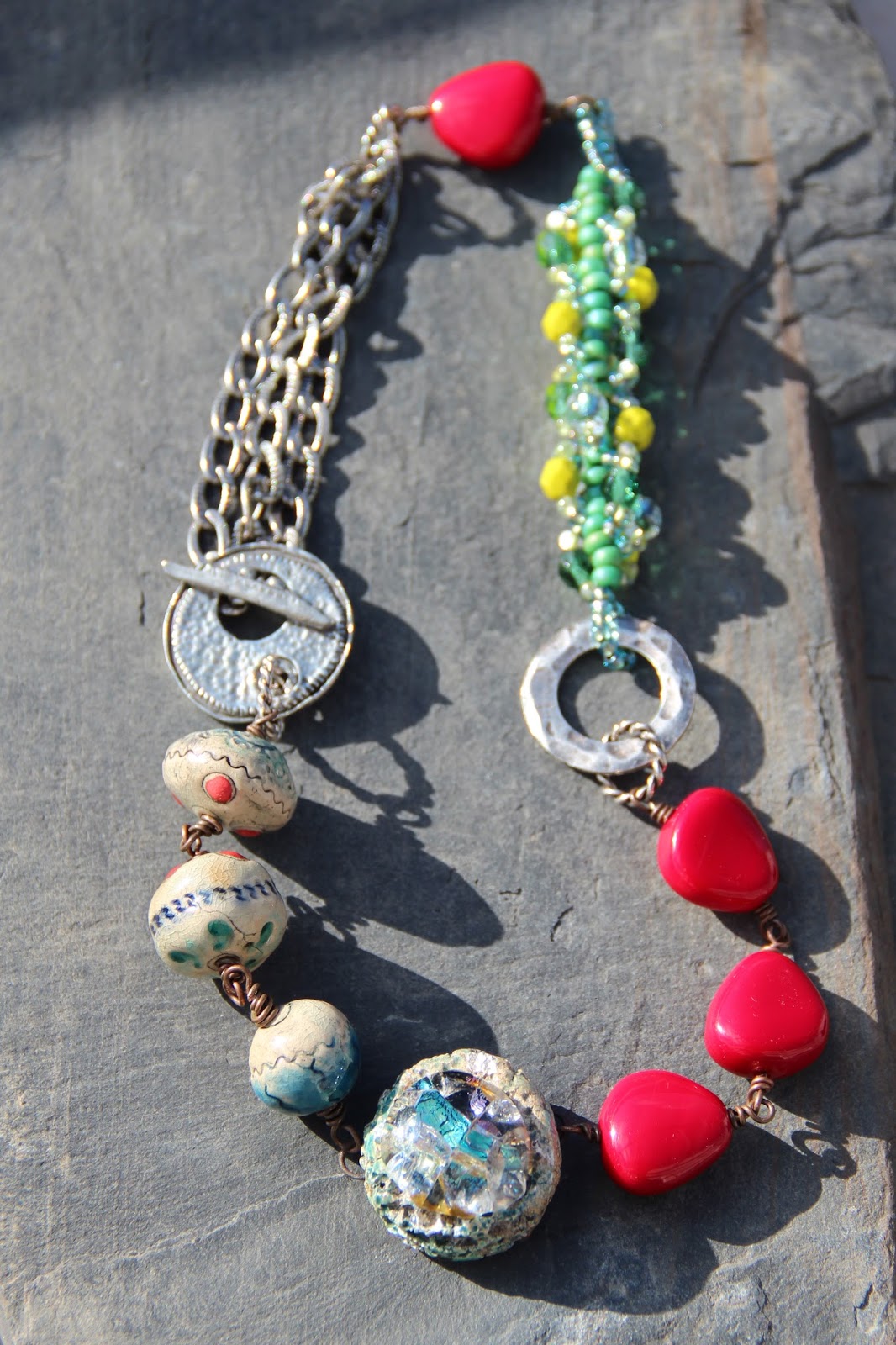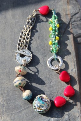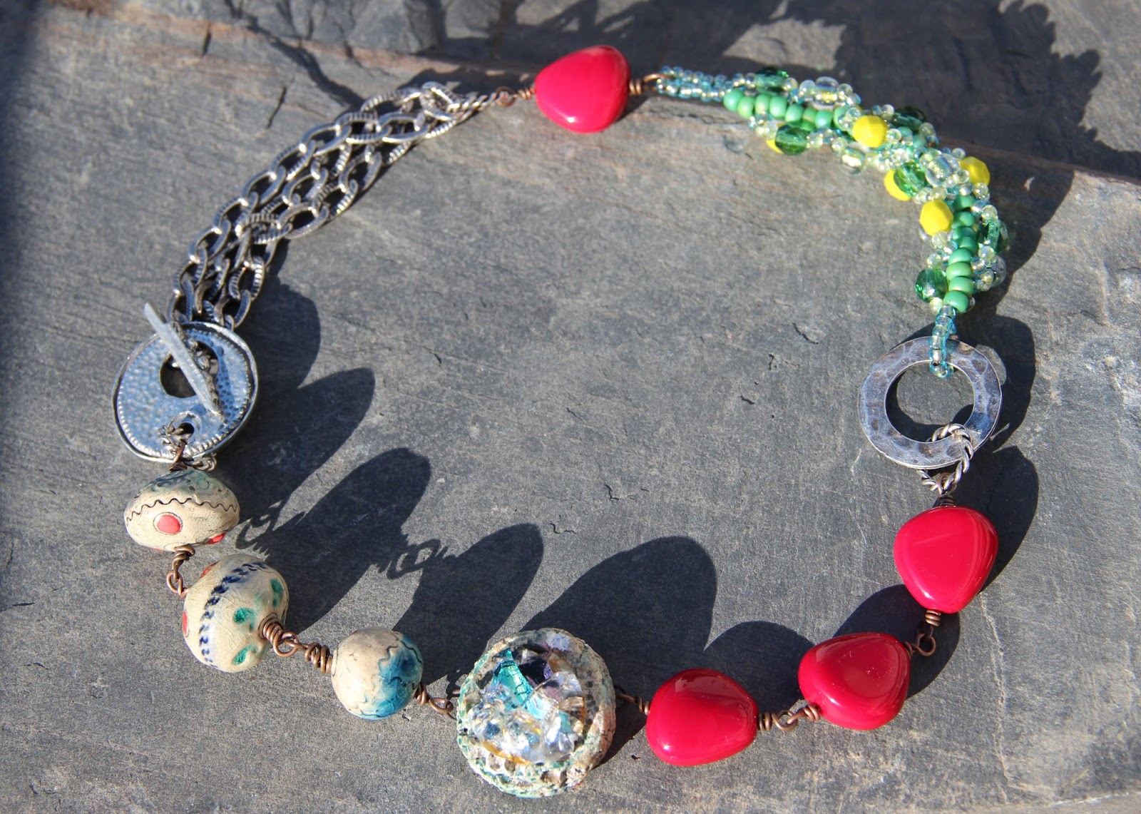 Red, blue, green and grey, metal, roughness, roundness, abundance and sleekness.A path to follow, but where you can stop any place.A necklace whose focal element you can choose according to wish or mood.