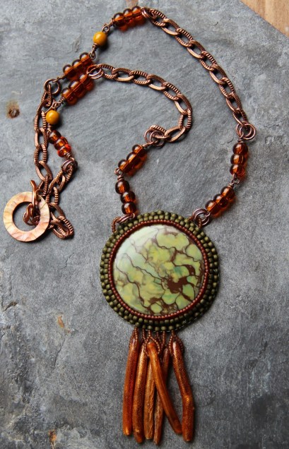 I had a green zebra jasper cabochon that I wanted to cheer up a little, some mother of pearl sticks (really I ‘m not sure about that, it’s a natural material but I can’t remember which one), some metal chain, glass beads and a hand made copper patinated toggle clasp from Supply Your Soul.