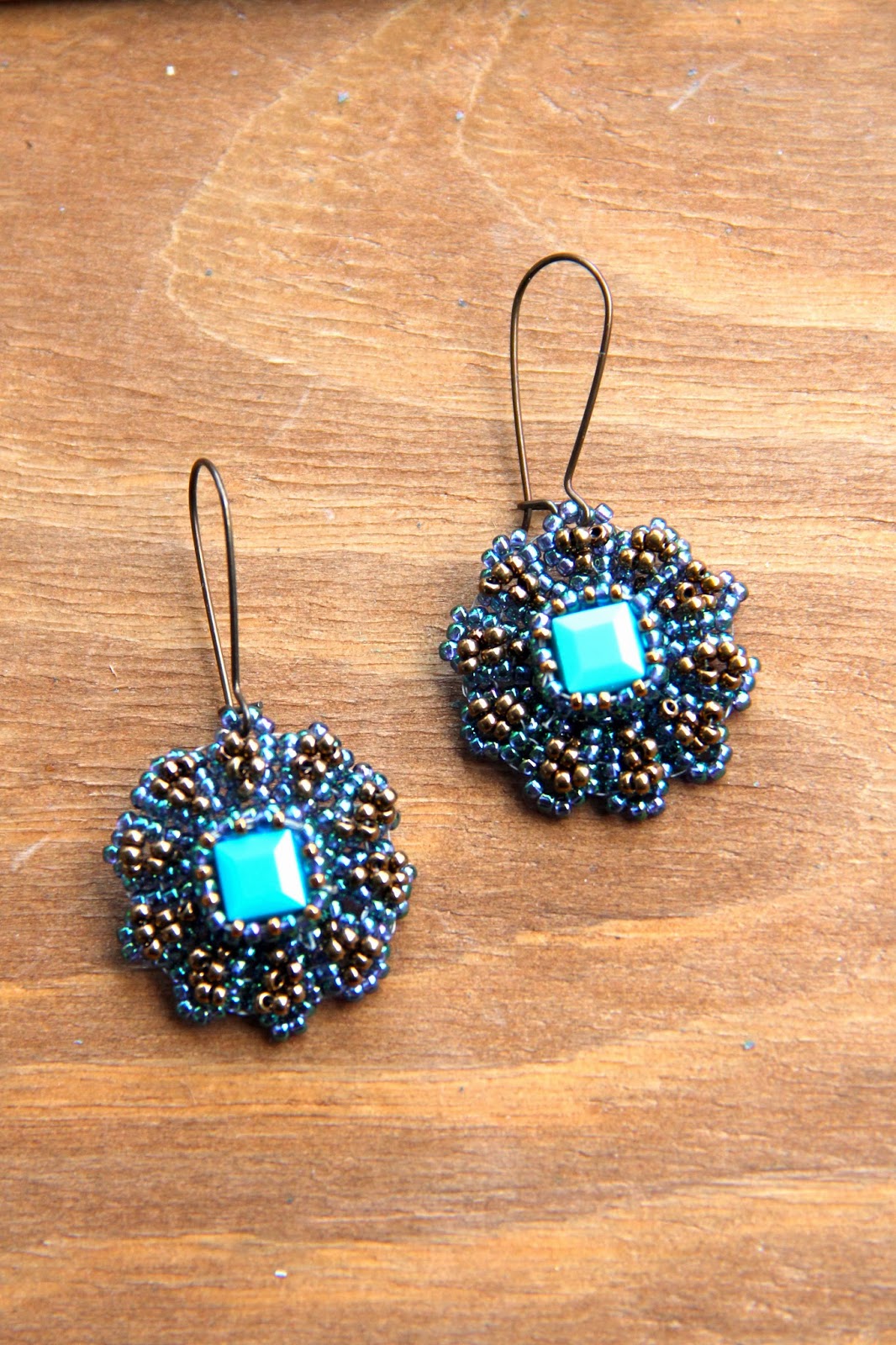 Aujourd’hui donc, des boucles d’oreilles. La seule difficulté au départ, le choix des perles dans le stock. Et bizarrement je me retrouve avec du bleu! Depuis plusieurs jours je rêve de couleurs d’automne, mais je finis avec du bleu!