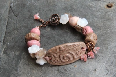Aux fleurs, au lin et au fermoir du kit, j’ai associé des perles et connecteurs de Angel Whisperer, Gaea et Grubbi.