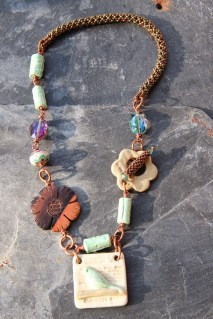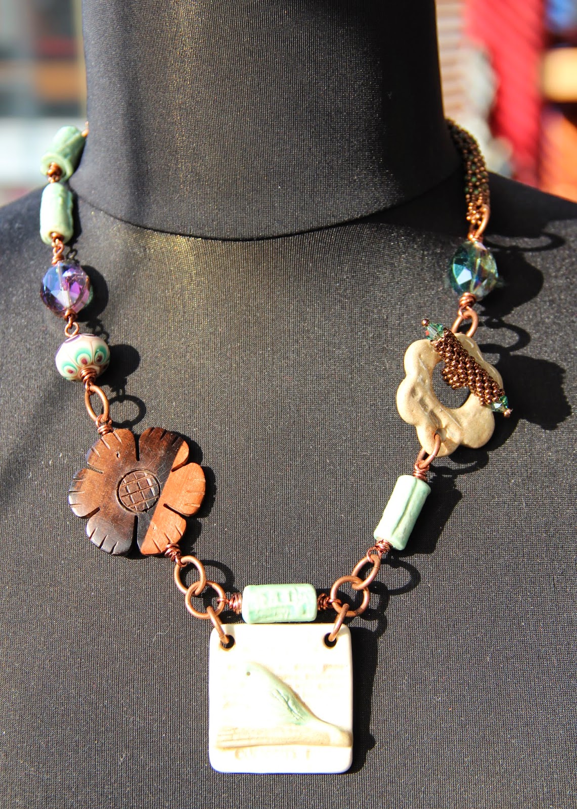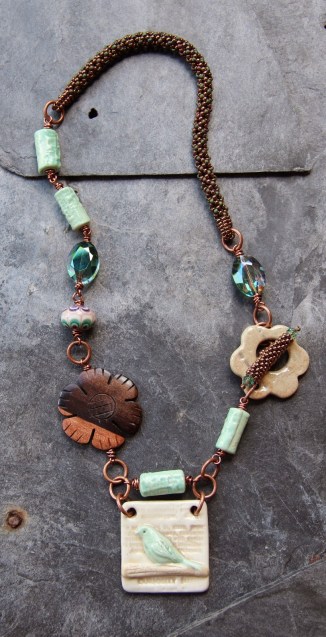 1. Beautiful art jewelry! The way the carved flower wood bead mirrors the shape of the clasp (and your ingenious beaded bar) and the nuances of wood & forest in your beaded rope & sky within your rich crystals — along with the sweetest touches of lampwork and asymmetry — come together in a confluence of magic, singing a song of joy! Lovely!