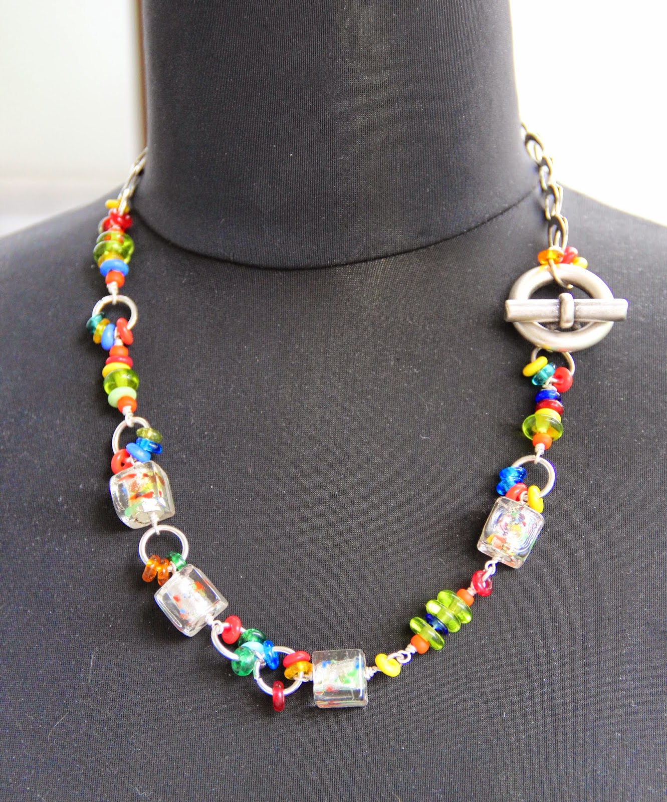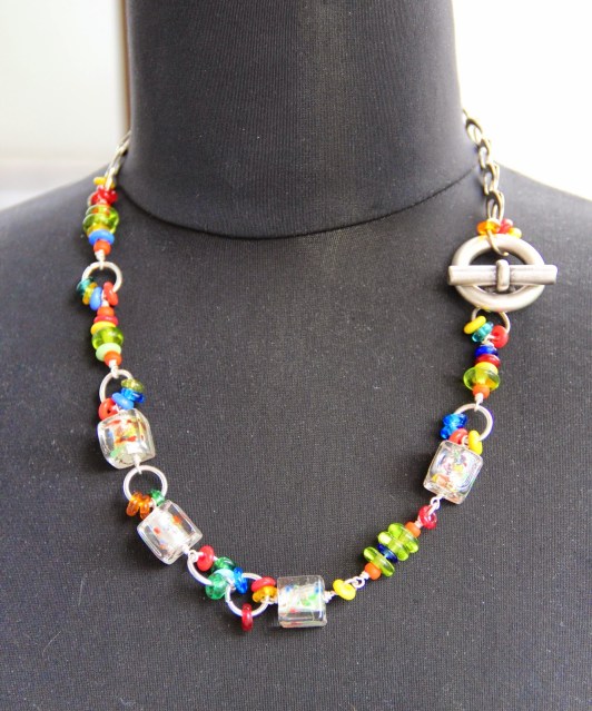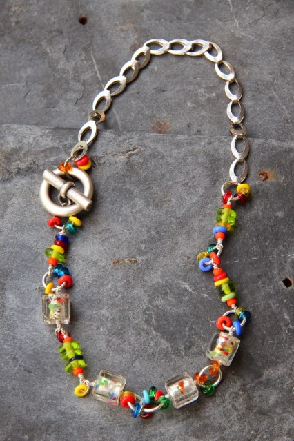 I also have color glass rings, that’s it. So I added some rings, made a bracelet and then added some more, it became a necklace. I continued to look into my oldest components, a toggle clasp, some chain and there it is.