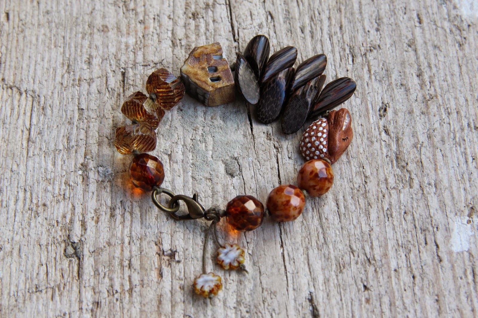 Enfin, j’ai reçu le kit de The Curious Bead Shop, Autumn Song (chanson d’automne), j’ai retrouvé un faon endormi de Tree Wings Studio et une maison en céramique d’Elukka en rangeant mes perles. Avec quelques perles en bois et en verre, j’ai complété la série avec un bracelet.