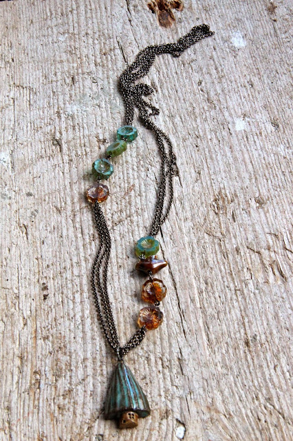 Then, as often happens I kept playing with the same colors and chose a ceramic pendant from Elukka, a tree house, maybe for some forest people. A bird, some flowers and a lot of chain later I had a long simple necklace.