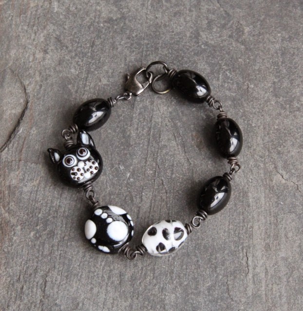 J’ai fouillé dans mes boîtes les plus vieilles, et dans les premières perles que j’ai acheté. J’y ai trouvé ces perles de verre noires et blanches, et cette perle en tête de chat et j’ai décidé que j’allais les utiliser. J’ai trouvé des perles récupérées chez Emmaüs, pris du fil d’acier et voilà un bracelet.