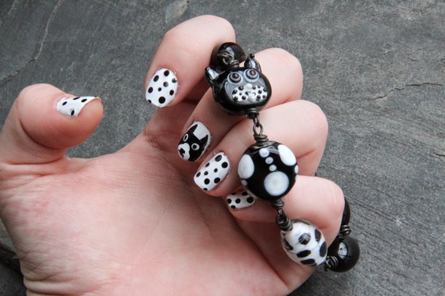 I love this bracelet. Black and white is so fun (like those nails!) and it's fun to know you used a mix of beads you've had a long time and thrift store beads. I love the steel wire. I need to use that more often.