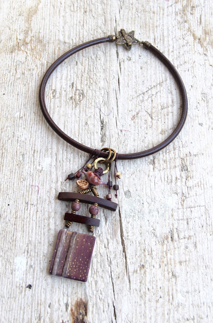 I took out recycled  wood beads from the thrift store, leather, linen, seeds, some Indonesian beads to accompany my pendant.