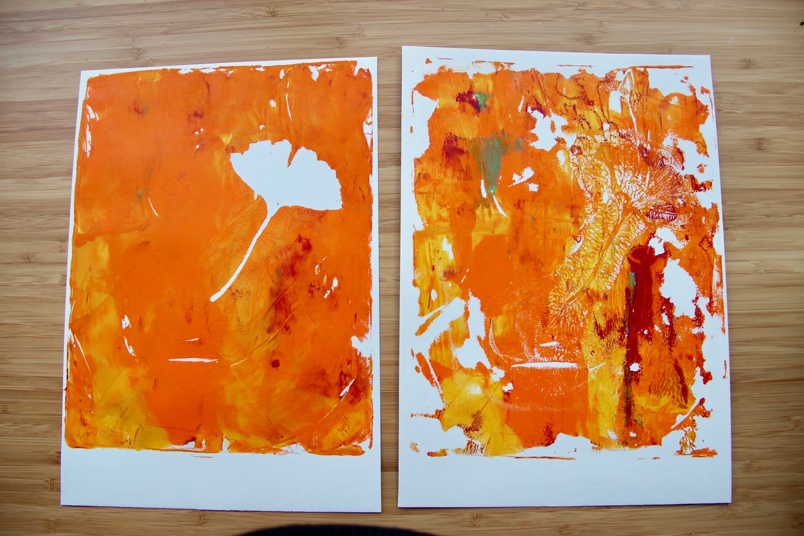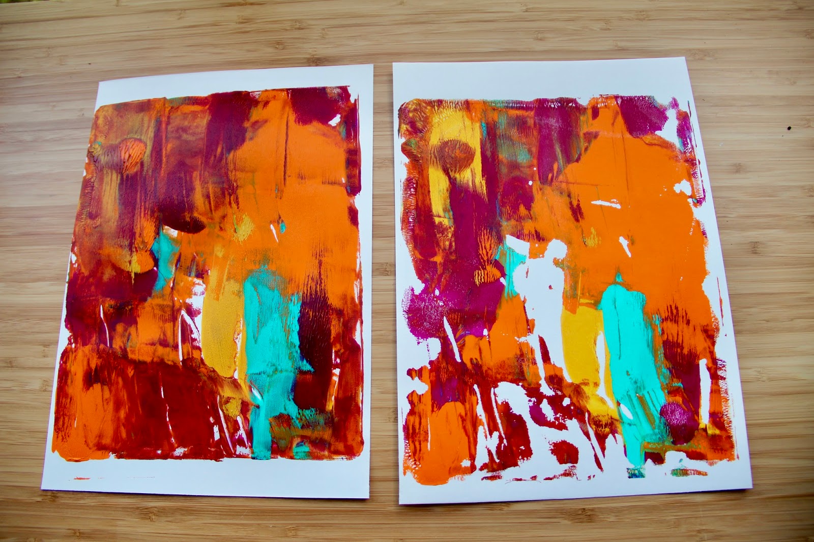Sur cette plaque, on étale une couche de peinture d’une ou plusieurs couleurs de façon aléatoire ou non, on peut laisser des impressions ou poser des objets. On pose une feuille dessus, on presse soigneusement et … surprise. Le résultat est souvent inattendu, la deuxième impression est souvent encore plus surprenante.