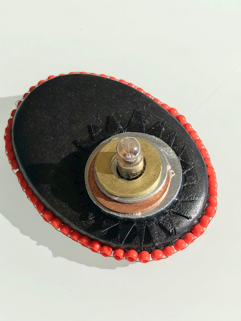 Then I took some of the rondelles, a tiny light bulb and some leather scraps I had bought in Sweden to make a brooch.
