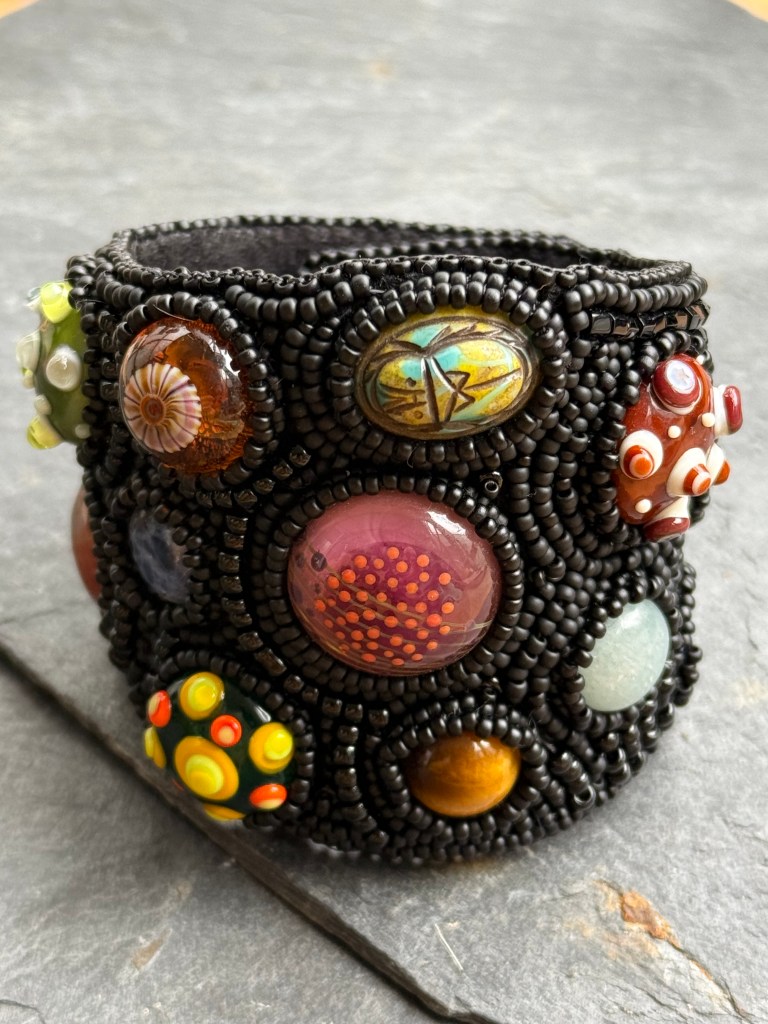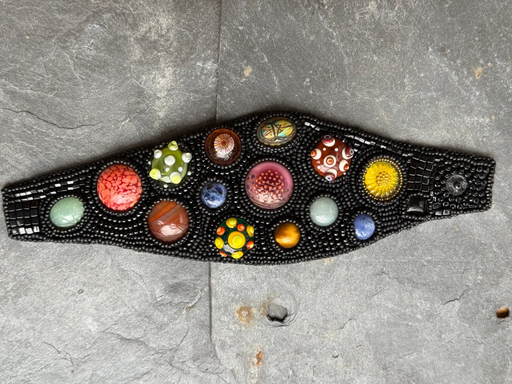 I selected all sorts of smaller cabochons, glass, ceramic, stone. I glued them on my foundation. Put the whole thing away. I took it back again, bezeled the cabs, and put it back away, until recently, almost 8 years later.