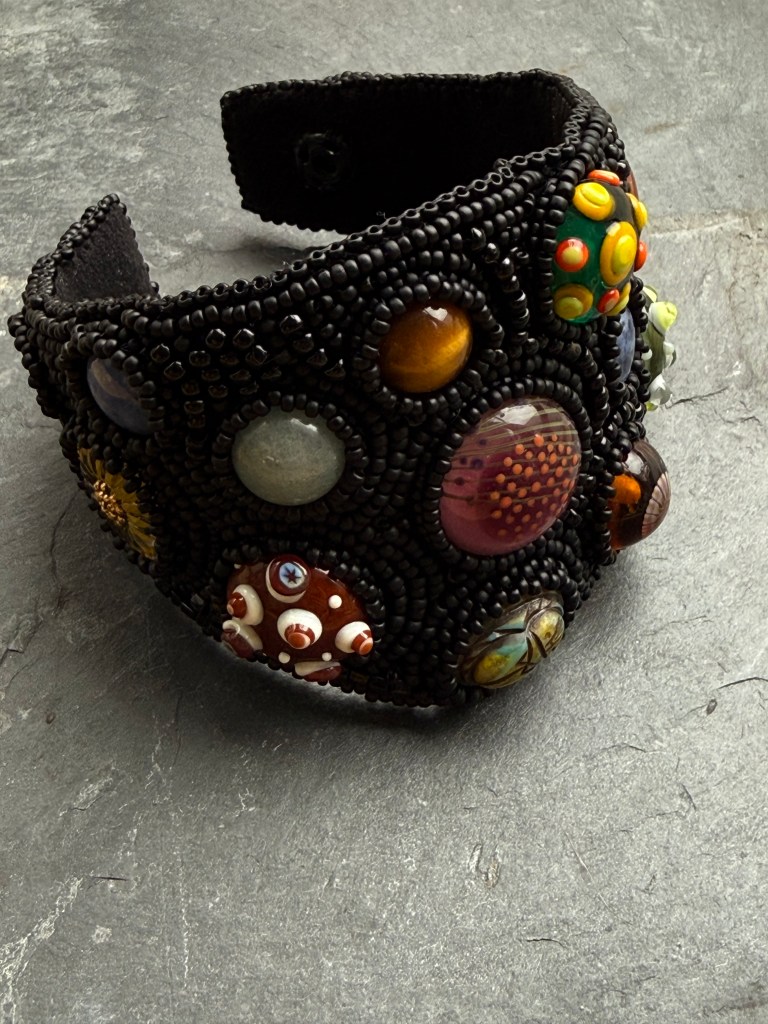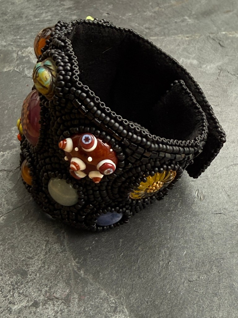 En 2018, je me suis lancée dans mon premier bracelet manchette brodé pour un défi, je ne sais plus lequel, mais j’en ai retrouvé l’inspiration dans mes photos.