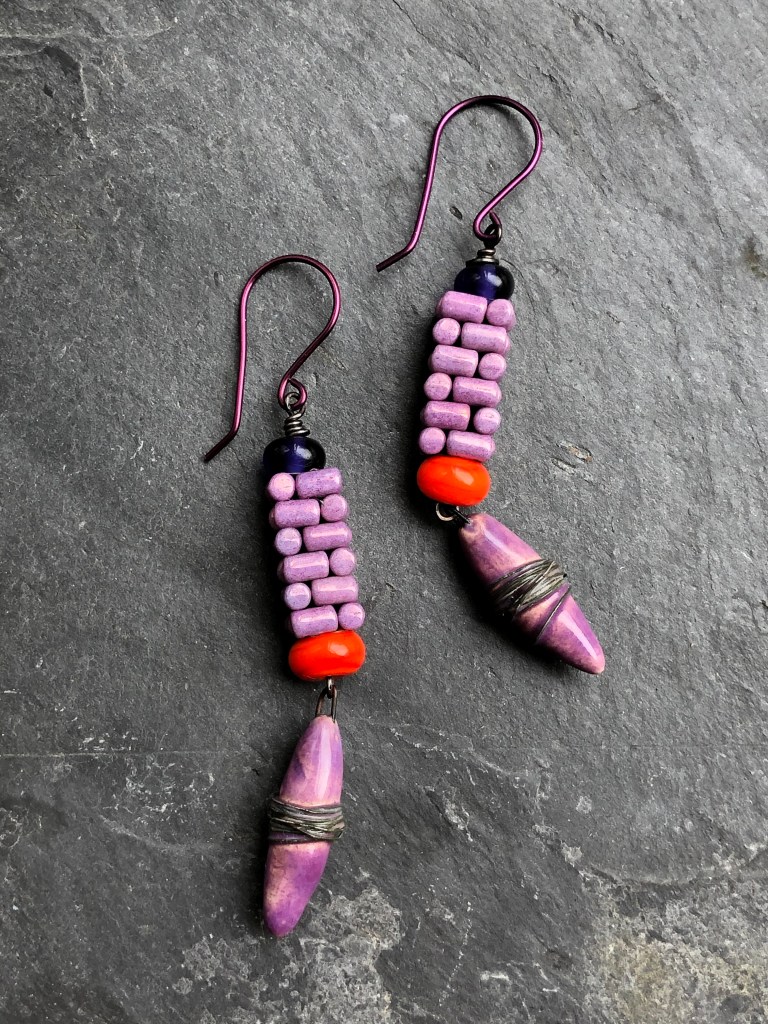 I thought I would create a lot during this lockdown, but no. I find this quite strange and annoying, so I pushed myself a little and turned to the Earrings Everyday monthly challenge. That is, you have to create a pair of earrings with a particular theme in mind, this month, Safer at Home. I didn’t want to go to the obvious house components, and I have plenty of them, but towards beads that would make me feel good. The result was really colorful! There were beads, brought back from family trips, that made me think of travelling, from favorite shops or that had travelled. This is where I feel good, on the move with my memories and my projects.