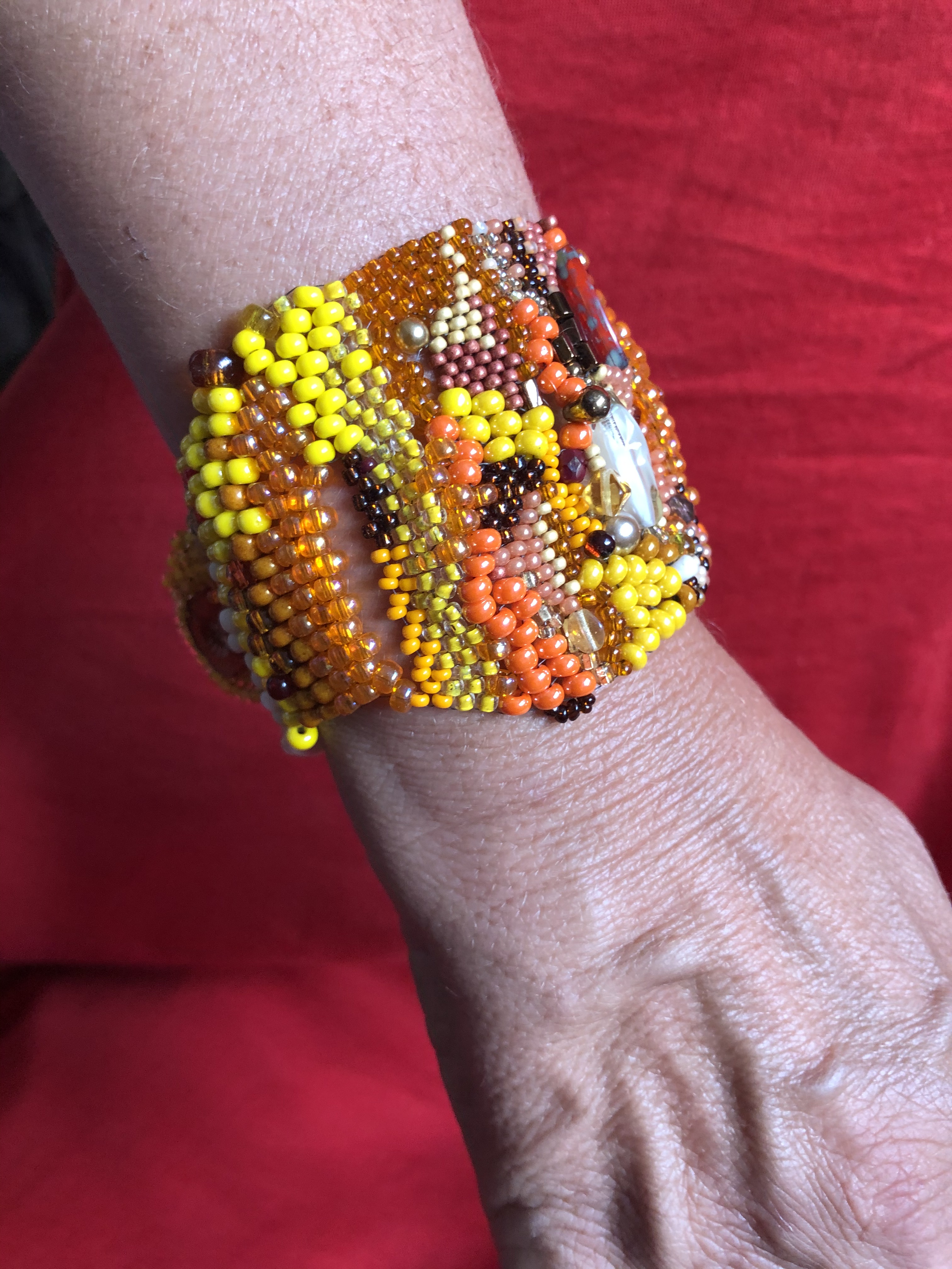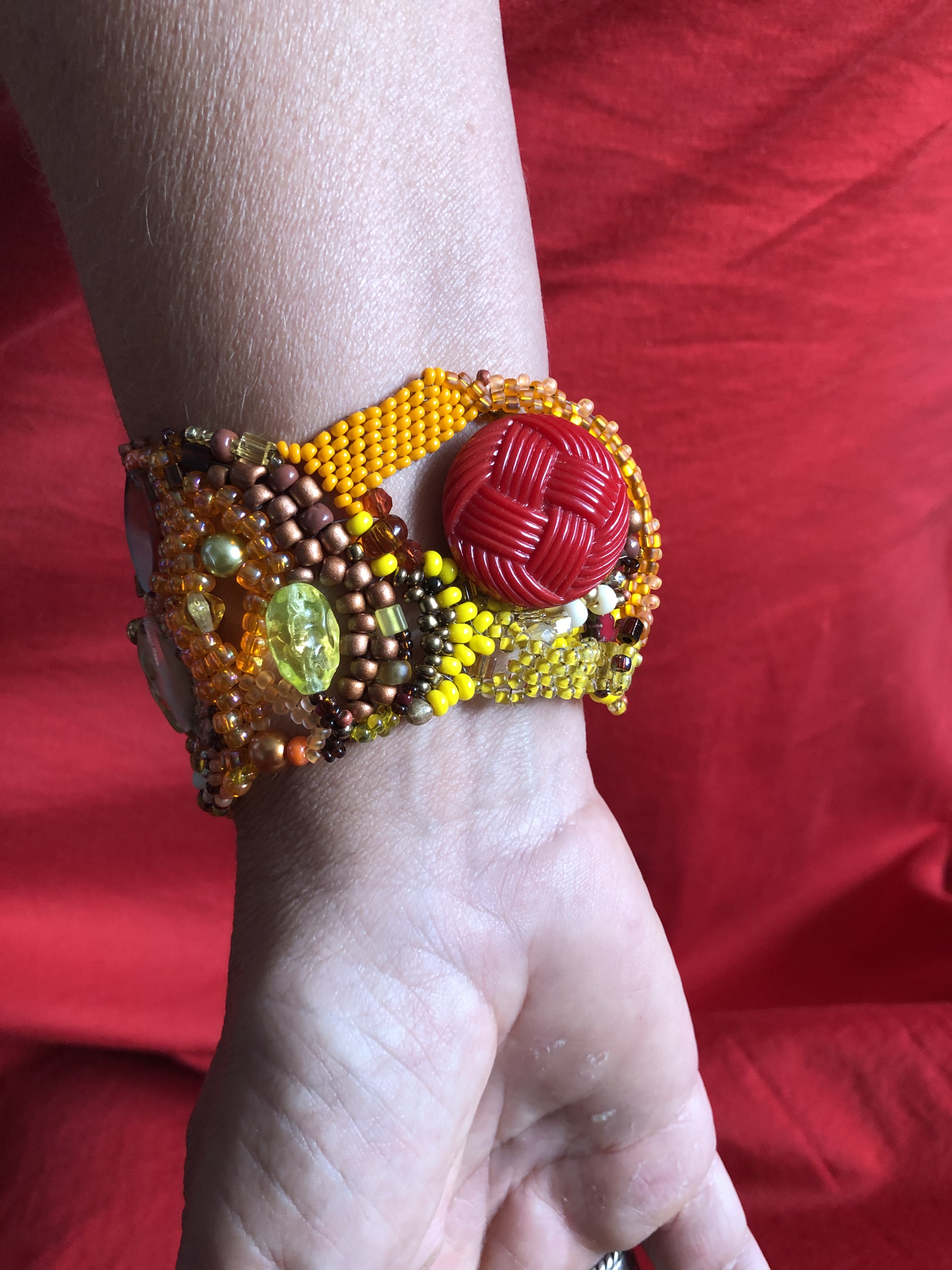 This is Jean Power’s Geometric Tila Bangle that I bought as a kit HERE. It is so magical, to follow simple instructions, play with beautiful colors and then have a fabulous geometrical 3D bangle!
