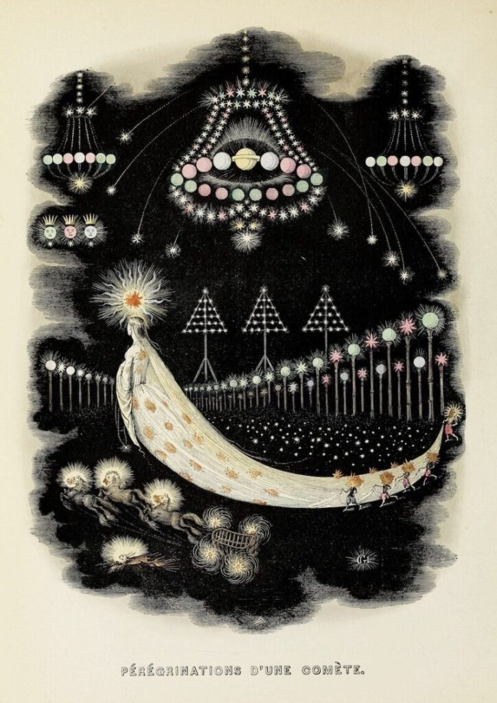 Voici un nom qui m’était totalement inconnu! Un illustrateur et caricaturiste français du 19ème siècle que je découvre grâce à Art Bead Scene Studio et à la 8ème inspiration de l’année. Et comme j’essaie toujours de reprendre un rhytme créatif, c’était une bonne habitude à reprendre. Une inspiration artistique, une création. Oui, mais pas si simple, pas d’inspiration! Comme le seul impératif est d’utiliser une perle d’artiste, c’est à dire une perle fabriquée de façon artisanale par un.e artiste, j’ai fait comme d’habitude, le tour de mes boîtes et des perles qui pouvaient refléter le travail de J. J. Grandville. Après avoir sélectionné différentes choses, toujours rien, et de ce premier tour, je n’ai gardé que les étoiles, que je destinais à des boucles d’oreilles. Et puis, le déclic finalement avec Pérégrinations d’une comète.