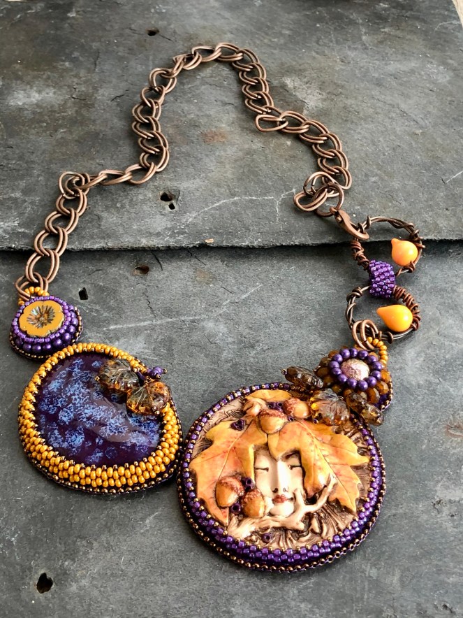 I thought I would come back here quickly but it took me three weeks. I thought I would have more time, but digital teaching is so time-consuming! Anyway, here I am, back on track I hope and since I couldn’t decide on only one project to start, I decided to finish one. One I had started in September 2017 for an Art Bead Scene monthly challenge and forgotten since (here). It took me one week to finish, I was never satisfied with the balance of the necklace. Finally, I decided it was done and here it is.