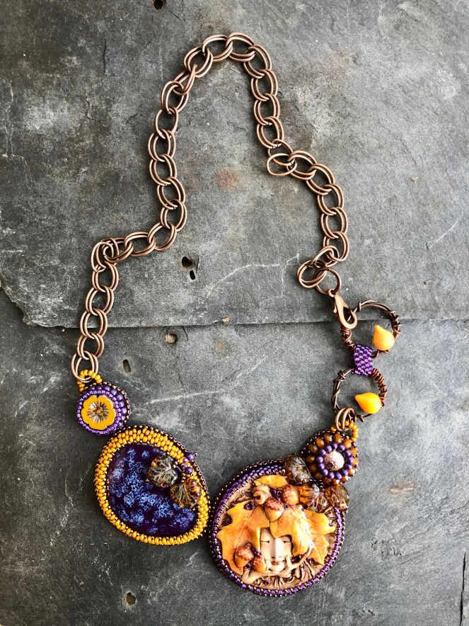 Trois semaines après avoir commencé à broder autour de ce cabochon en pâte polymère sans trop savoir quoi en faire, voici un collier. Au fur et à mesures d’autres perles et un cabochon de chez Majoyoal brodés aux couleurs de l’automne se sont imposés. Les cercles en cuivre et verre sont des tiges que j’avais travaillé pour des boucles d’oreilles. L’une d’elles s’est cassée. Rien ne se perd. Par contre, j’ai pris conscience du temps passé depuis ces boucles d’oreilles faites en mars 2016, le cabochon acheté en septembre 2014 chez Sculpted Windows et maintenant, et comme le plaisir de manier les couleurs m’avait manqué, mais j’y travaille.