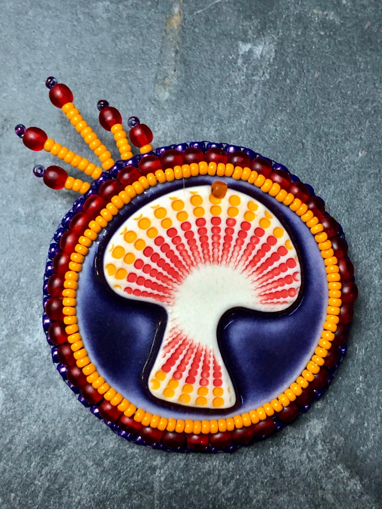 I’ve finally completed a piece, three weeks after having started beading around this cabochon. At the time I had no idea what it would become, maybe a brooch, but then it evolved, I beaded around several other beads and a cabochon from Majoyoal and there it is. I even used glass headpins I had used in earrings in 2016 of which one broke. I had quite a shock realizing how time had fled since I bought this polymer cabochon from Sculpted Windows in September 2014. And how I missed playing with beads and colors, but this I’m working on.