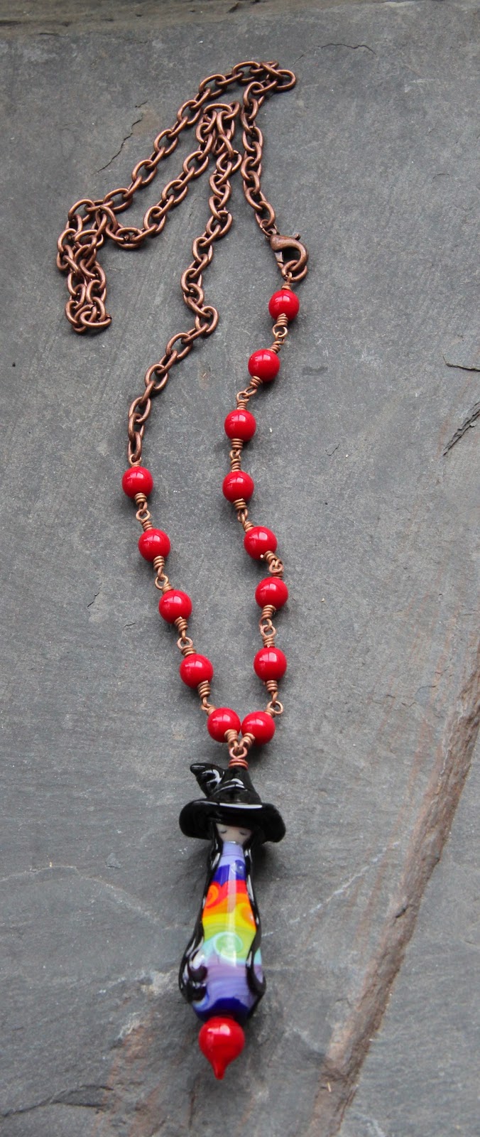 Not long after I signed up, I noticed some beautiful witch beads in Soul Silver‘s shop. They were hard to get, they never stayed long in the shop, but one day I was lucky. I’m not sure that counts as superstition but it was too beautiful not to use. However to stay in the theme I added thirteen red beads to the necklace.