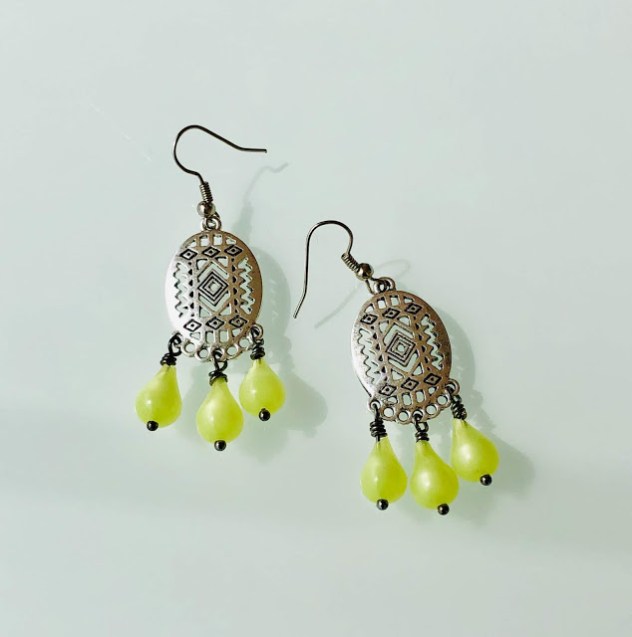 Et enfin des boucles d’oreilles avec de petites perles lumineuses en plastique qui font probablement parti de mes premiers achats sur Etsy, il y a plus d’une dizaine d’années.