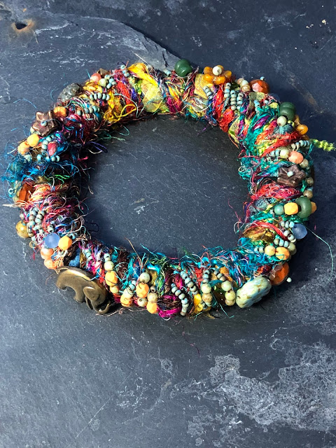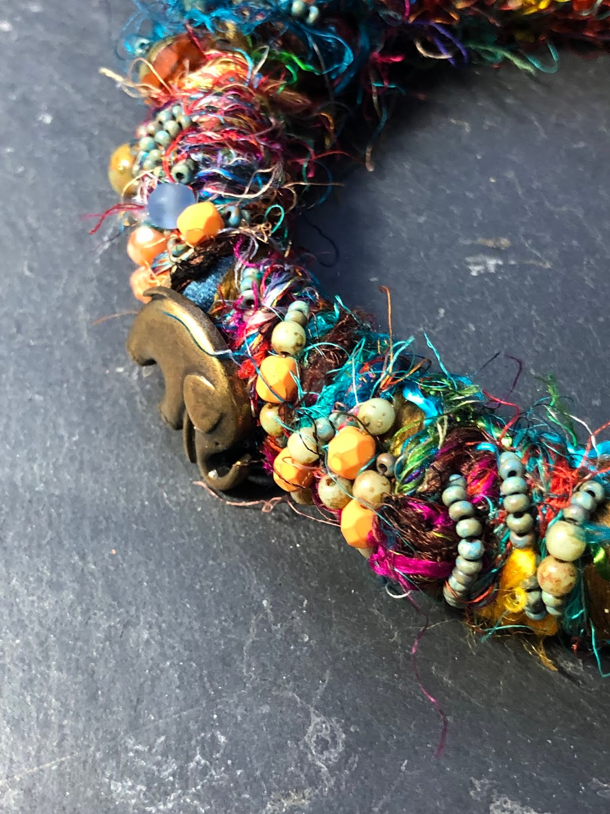 I took a bit of rope, bits of ribbons, some sari silk, bead and buttons. I love it!
