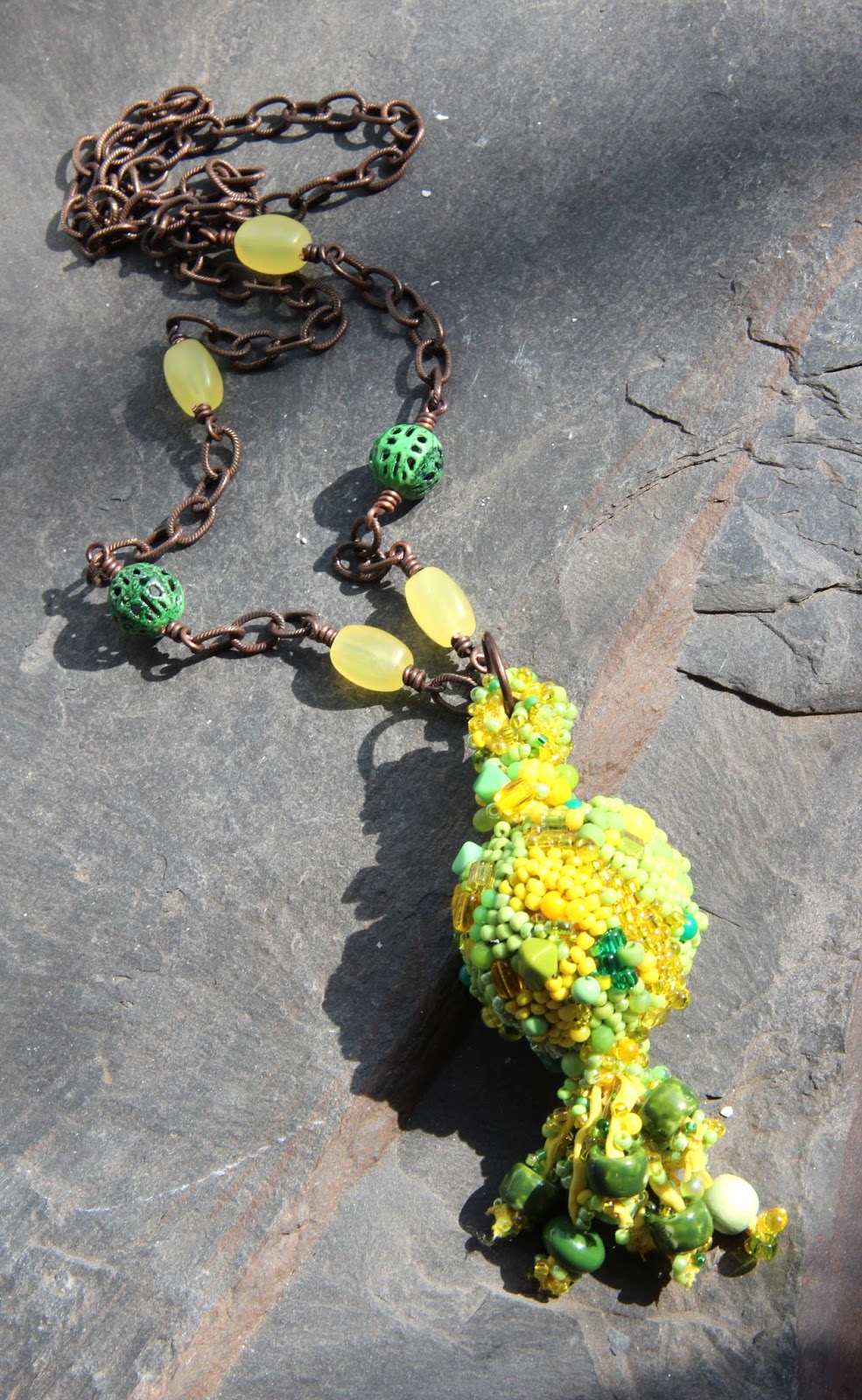 Then came a necklace made from chain thrifted from Emmaüs, and lots of dangles, carved stone animals bought from Kimberly Rogers at Numinosity Beads, Ex-votos bought from the Allegory Gallery and tiny stones.