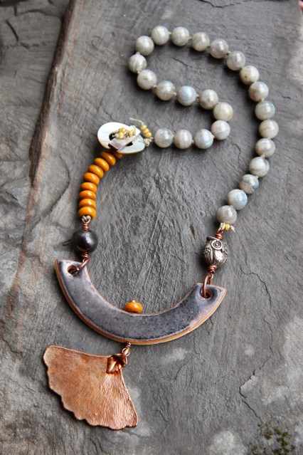 Pour finir des pierres de labradorite, un fermoir en nacre, du lin pour le côté naturel.