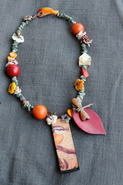 Je suis partie de la branche et j’ai trouvé ce grand pendentif connecteur en céramique de Elaine Ray et sa perle assortie.