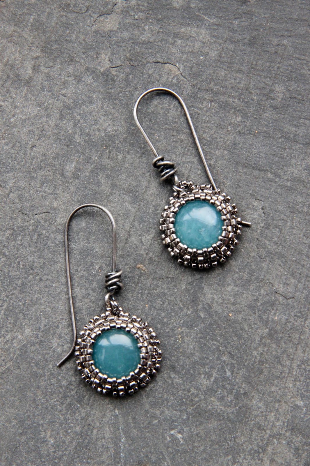 I’ve finally completed a piece, three weeks after having started beading around this cabochon. At the time I had no idea what it would become, maybe a brooch, but then it evolved, I beaded around several other beads and a cabochon from Majoyoal and there it is. I even used glass headpins I had used in earrings in 2016 of which one broke. I had quite a shock realizing how time had fled since I bought this polymer cabochon from Sculpted Windows in September 2014. And how I missed playing with beads and colors, but this I’m working on.