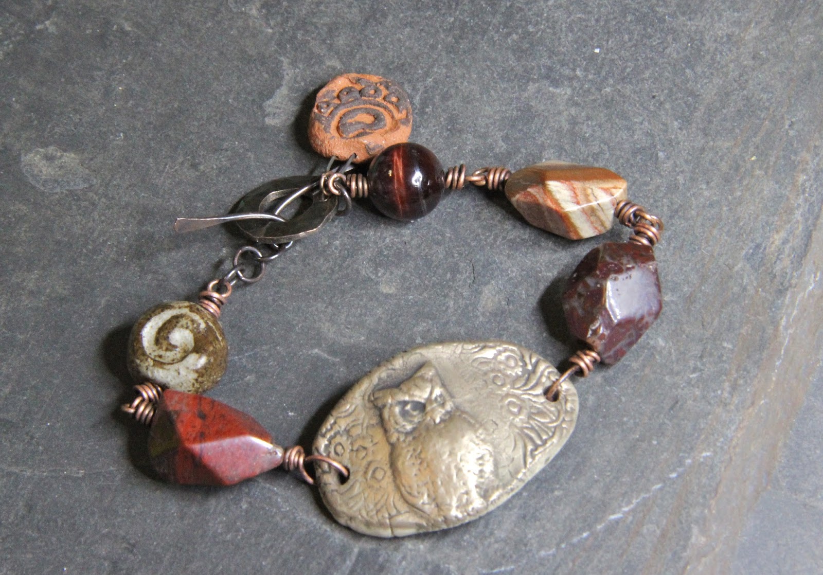 Yesterday I received an order from Angel Whisperer with among other beauties a bracelet bar figuring an owl. I have many owls in beads and yet I seldom use them. It is often the beads that appeal to me the most that I don’t dare use.