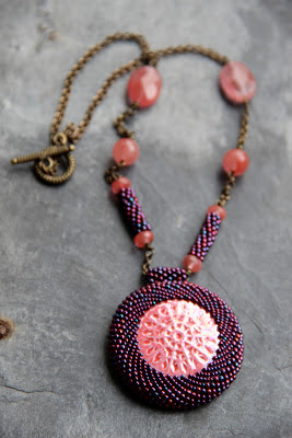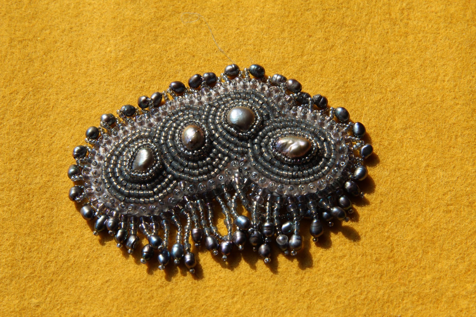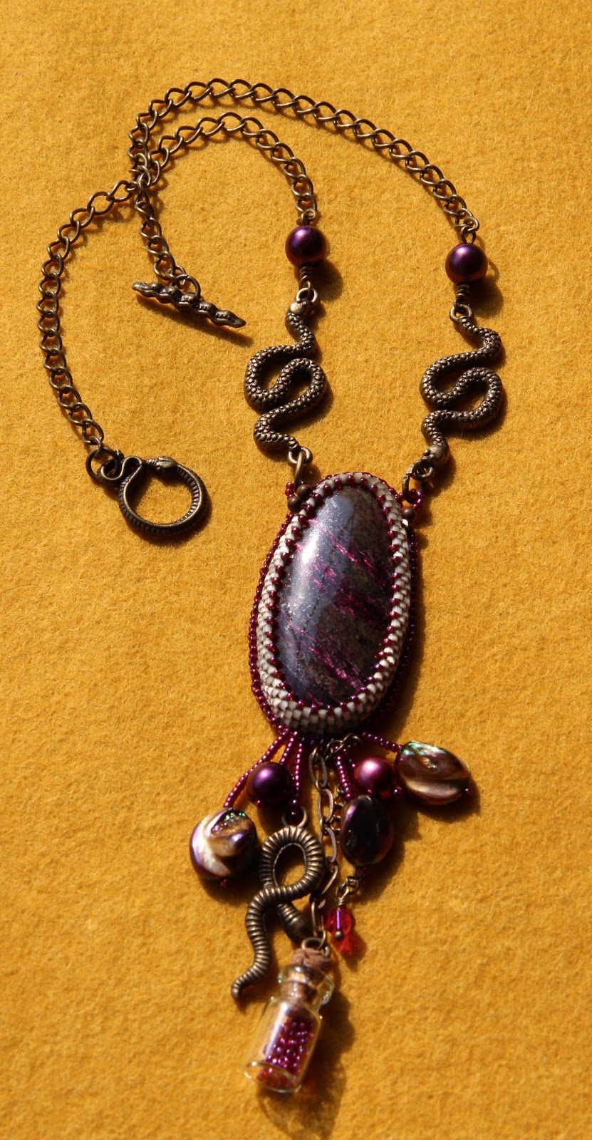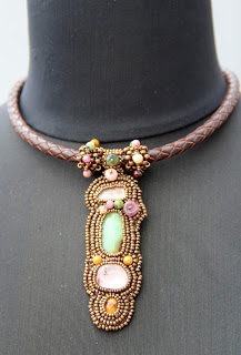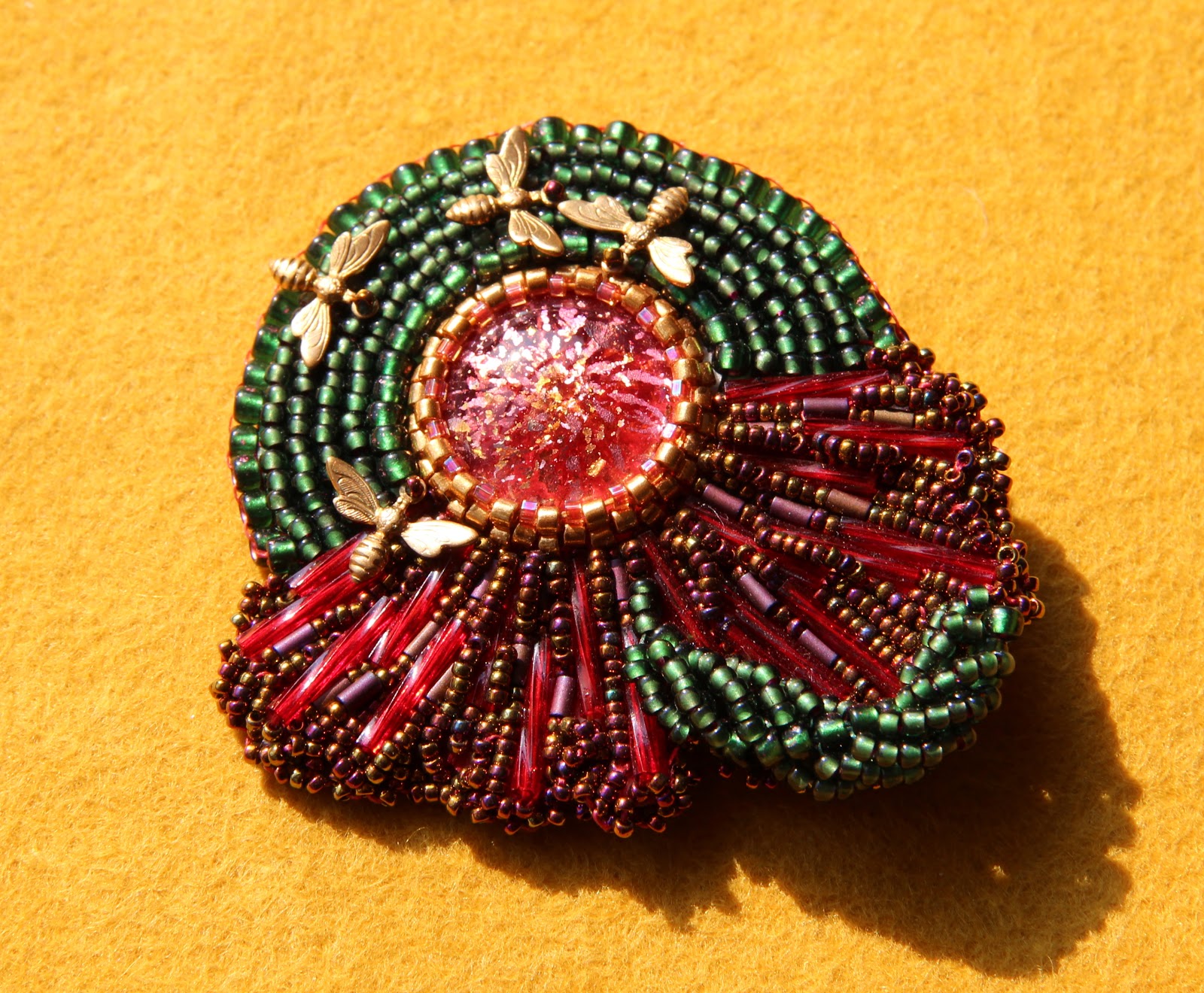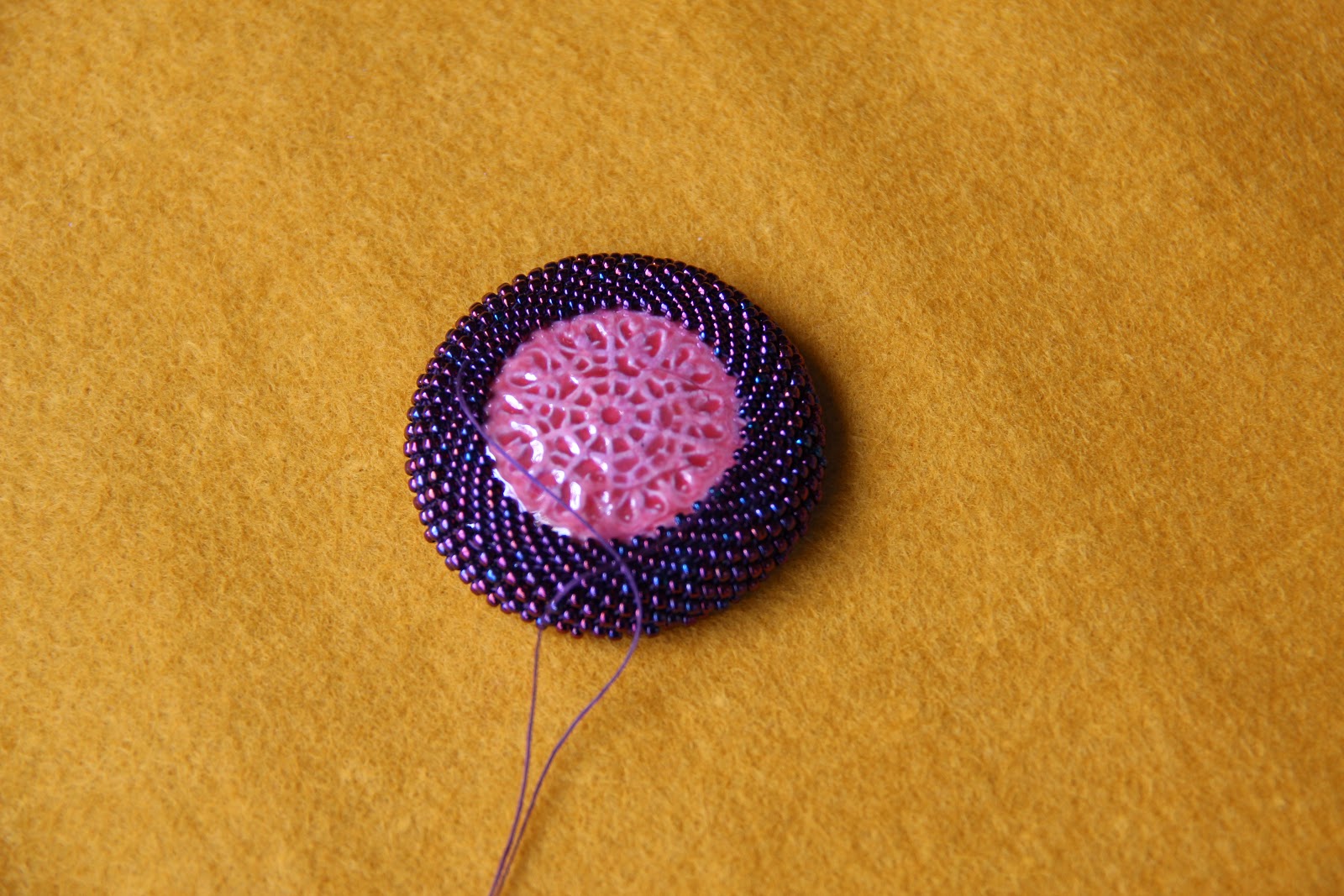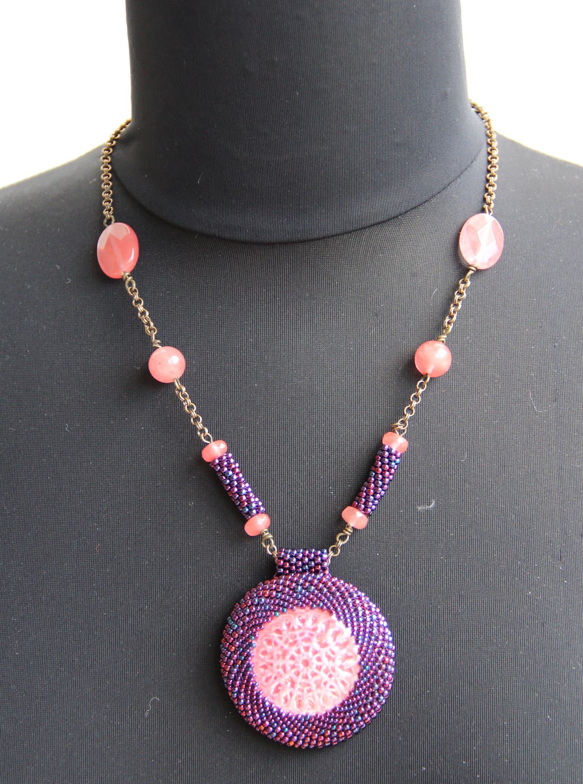 I’ve finally completed a piece, three weeks after having started beading around this cabochon. At the time I had no idea what it would become, maybe a brooch, but then it evolved, I beaded around several other beads and a cabochon from Majoyoal and there it is. I even used glass headpins I had used in earrings in 2016 of which one broke. I had quite a shock realizing how time had fled since I bought this polymer cabochon from Sculpted Windows in September 2014. And how I missed playing with beads and colors, but this I’m working on.