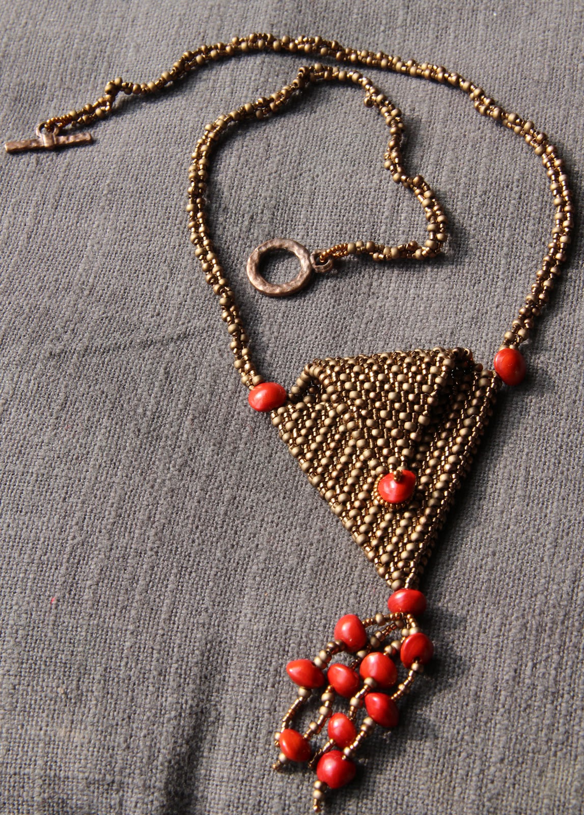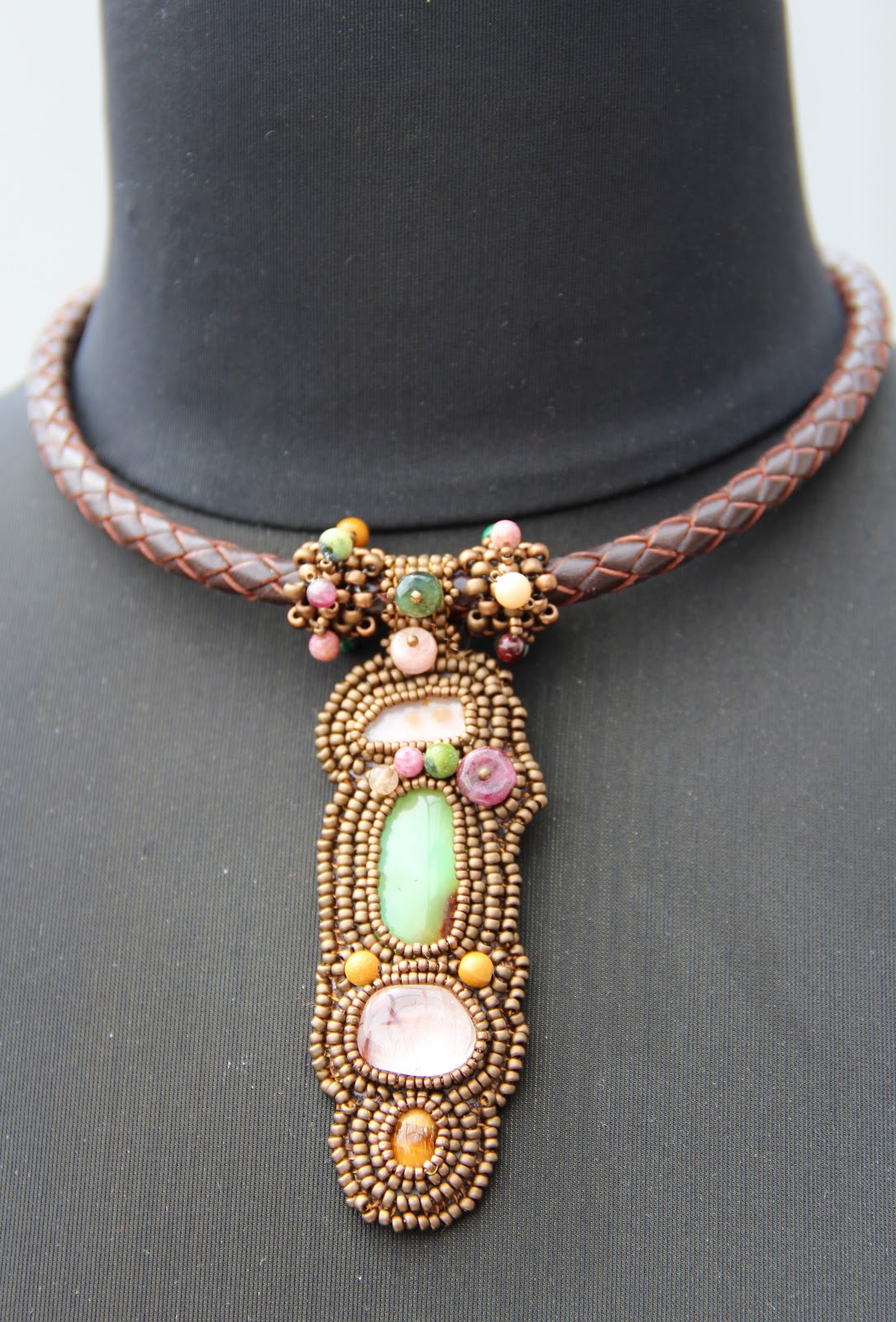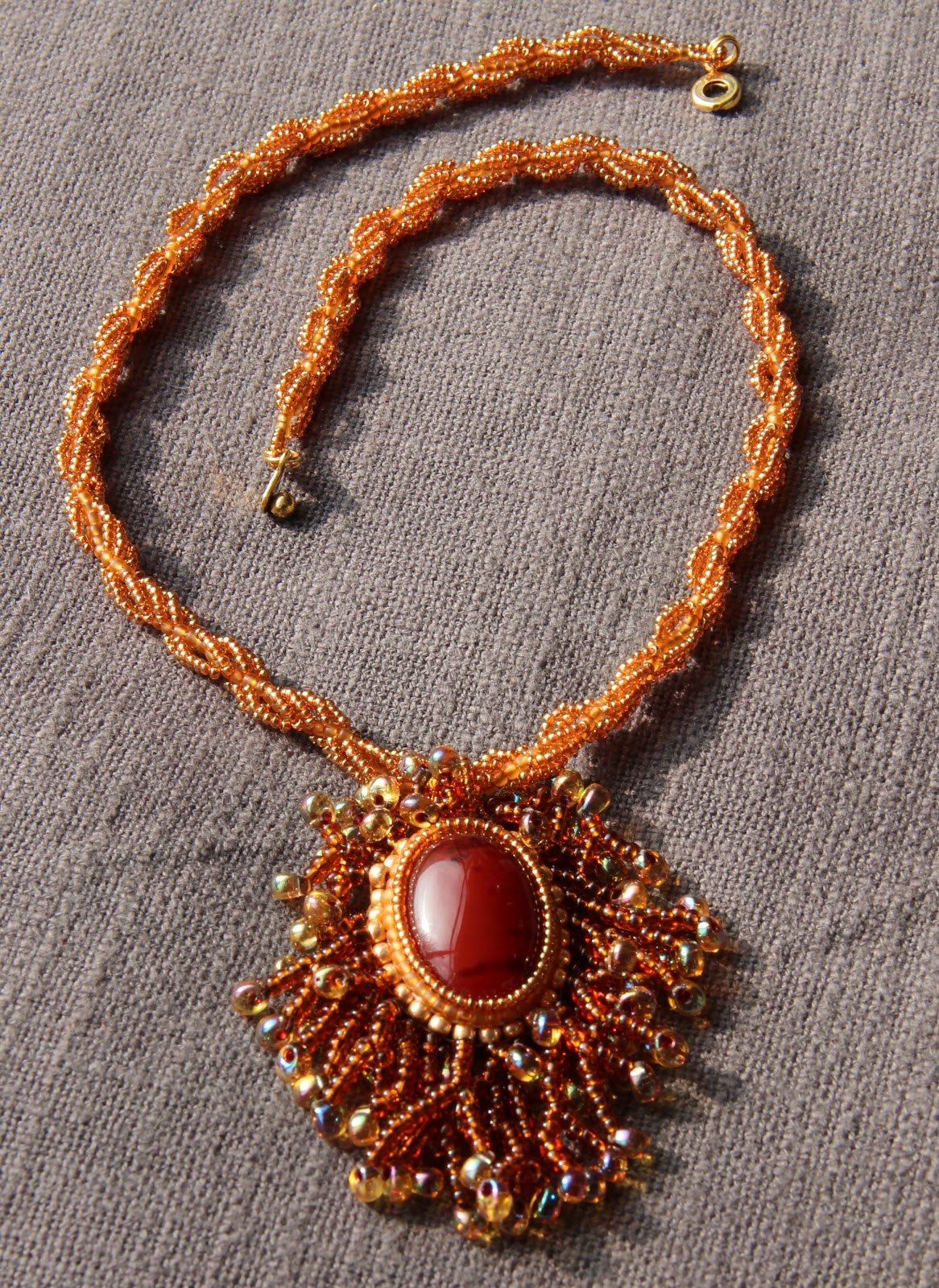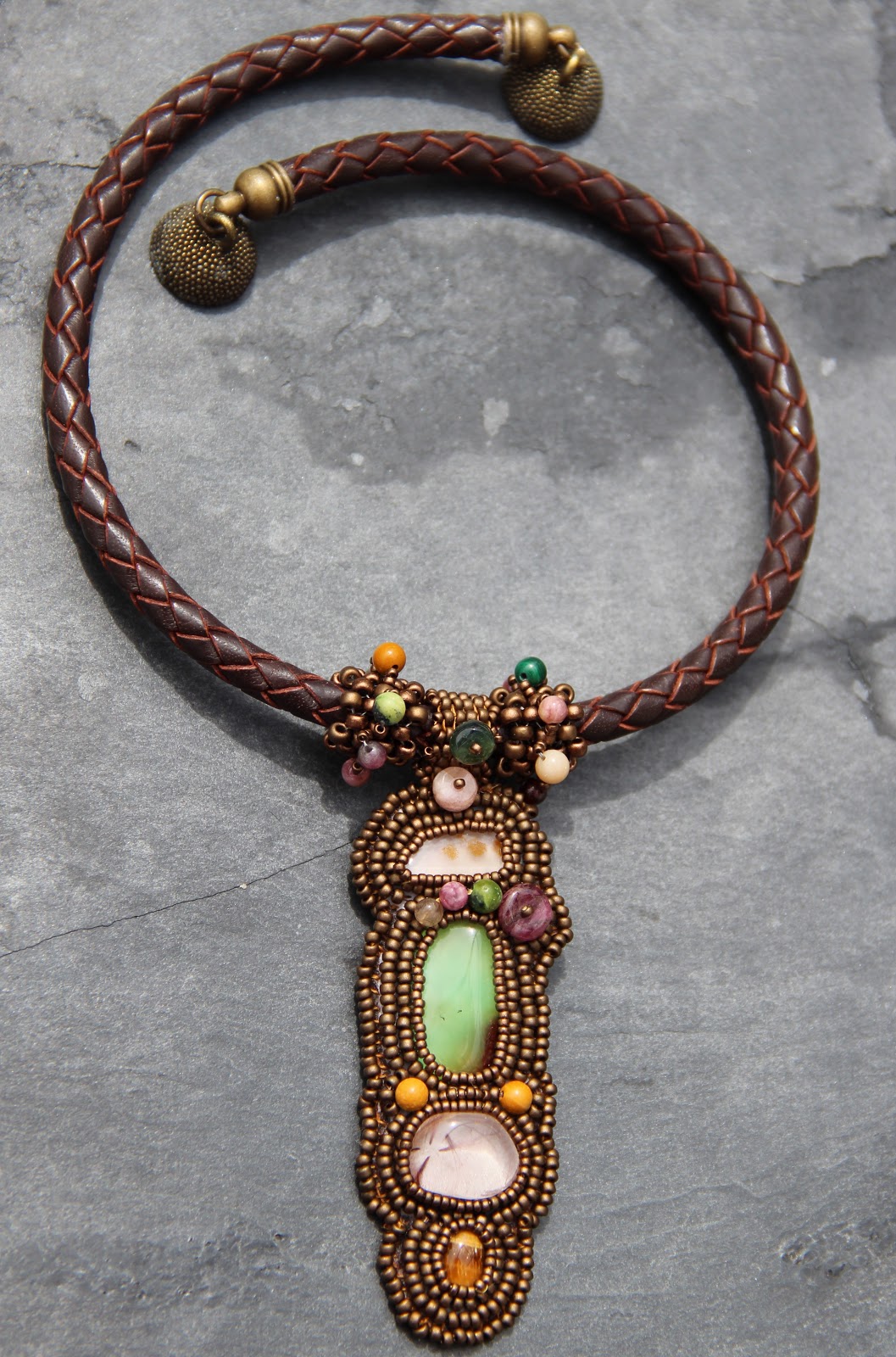 Trois semaines après avoir commencé à broder autour de ce cabochon en pâte polymère sans trop savoir quoi en faire, voici un collier. Au fur et à mesures d’autres perles et un cabochon de chez Majoyoal brodés aux couleurs de l’automne se sont imposés. Les cercles en cuivre et verre sont des tiges que j’avais travaillé pour des boucles d’oreilles. L’une d’elles s’est cassée. Rien ne se perd. Par contre, j’ai pris conscience du temps passé depuis ces boucles d’oreilles faites en mars 2016, le cabochon acheté en septembre 2014 chez Sculpted Windows et maintenant, et comme le plaisir de manier les couleurs m’avait manqué, mais j’y travaille.