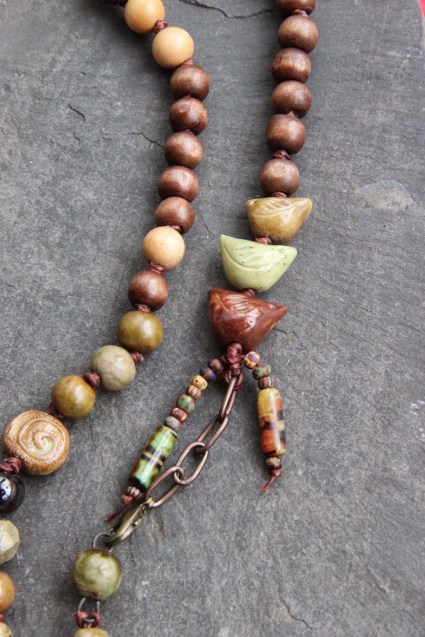 Alors, j’ai mélangé cuir, metal, améthyste et pendentif artisanal en céramique.