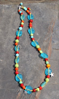 I took the blue and this time added color, yellow cord, orange, green and red beads, silver stars and I knotted.