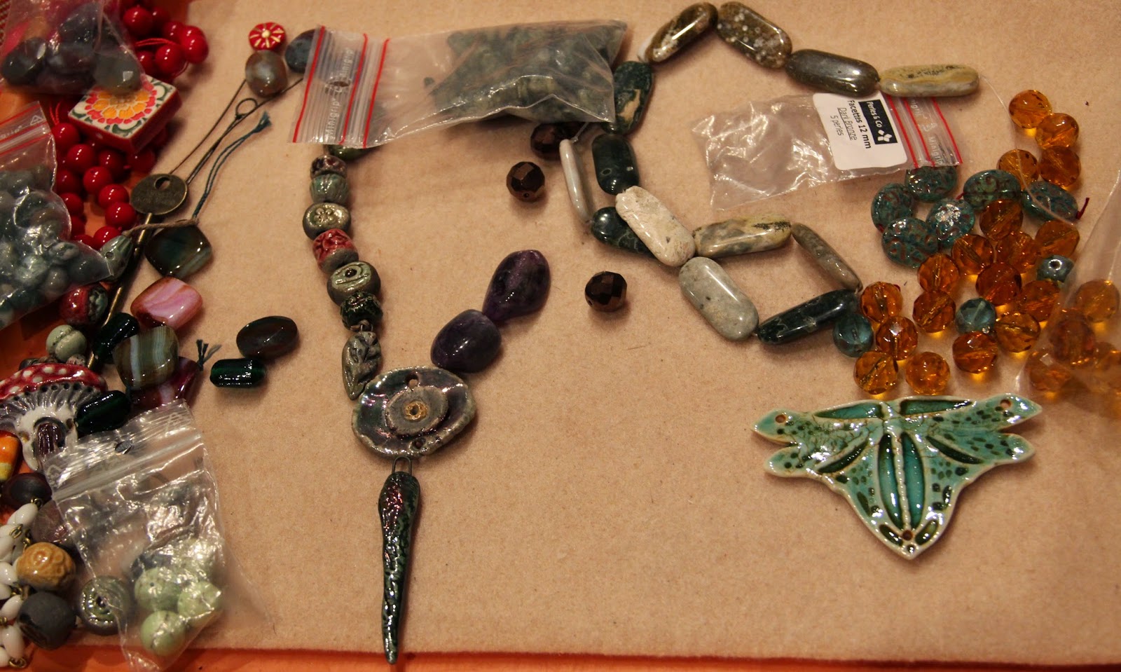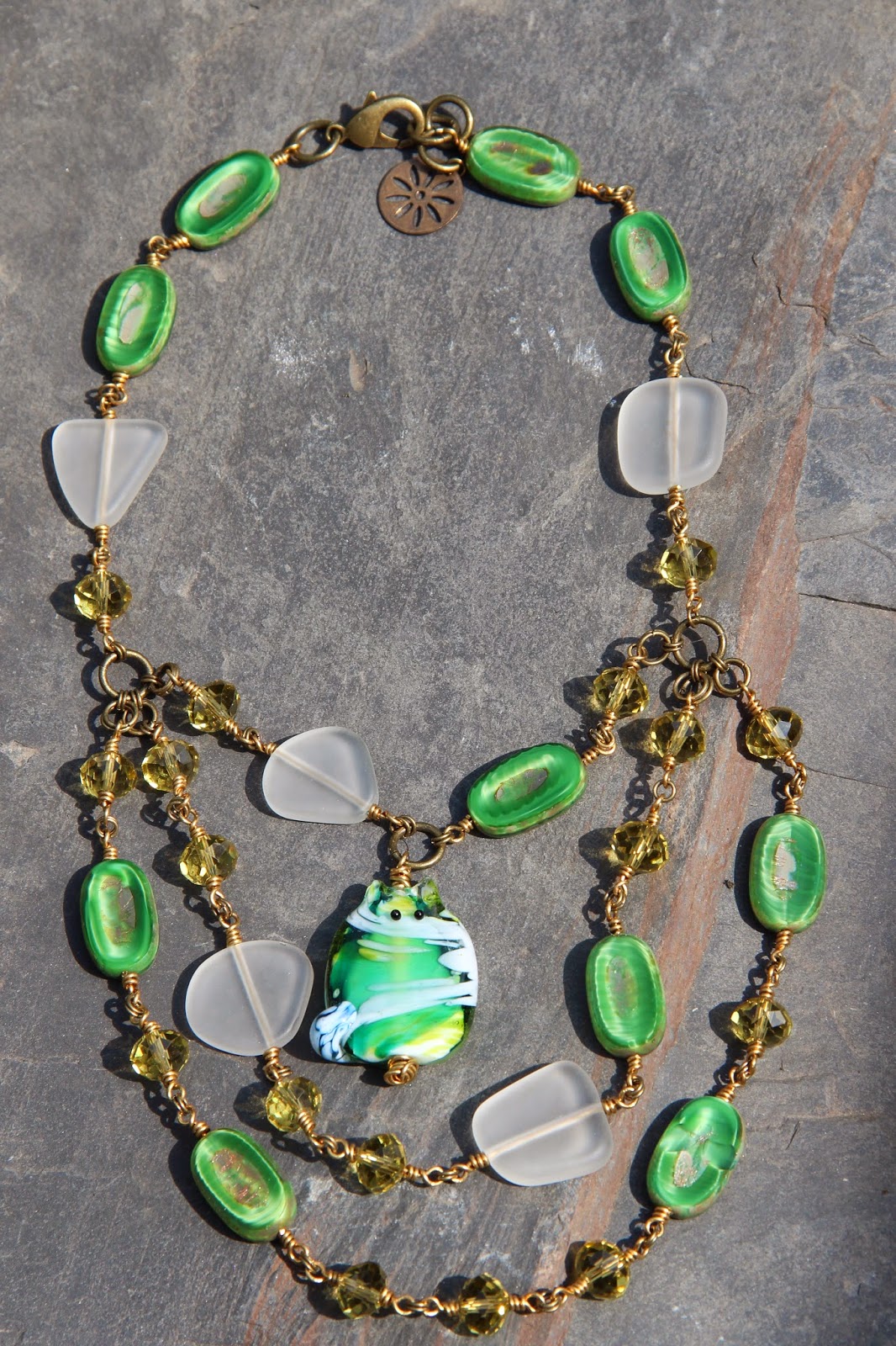 No more blue, but I still have a lot of pale yellow and the matte clear ones. I dug in my stash and came out with some large green Czech glass beads and lamp work cat by Teri Persing. It is one of my first Art Bead, I bought it in June 2009.