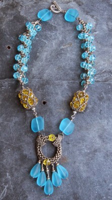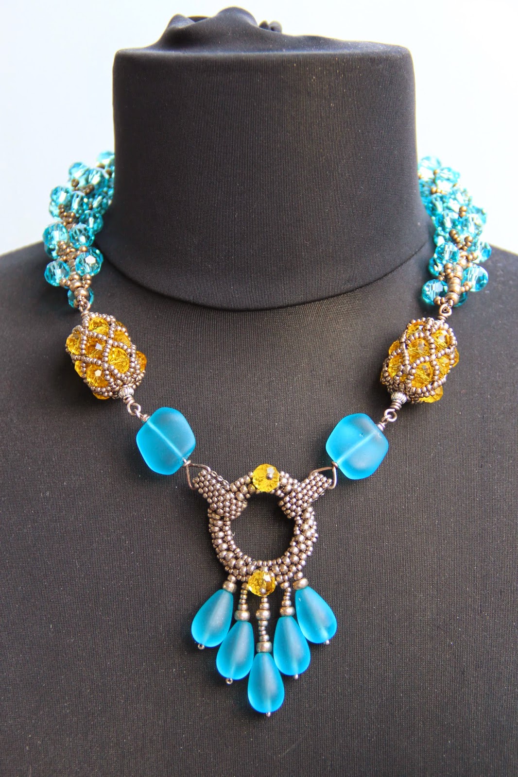 So a blue spiral, then I adapted a netting stitch to adjust to the yellow beads. After making all these elements, how was I to connect them together, a little more weaving, some beads, a little wire working and here I have a necklace that reminds me more of the Venice Carnival, than of summer, but that’s still Carnaval.