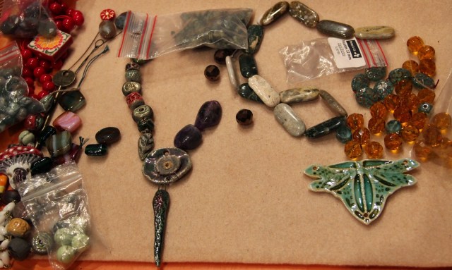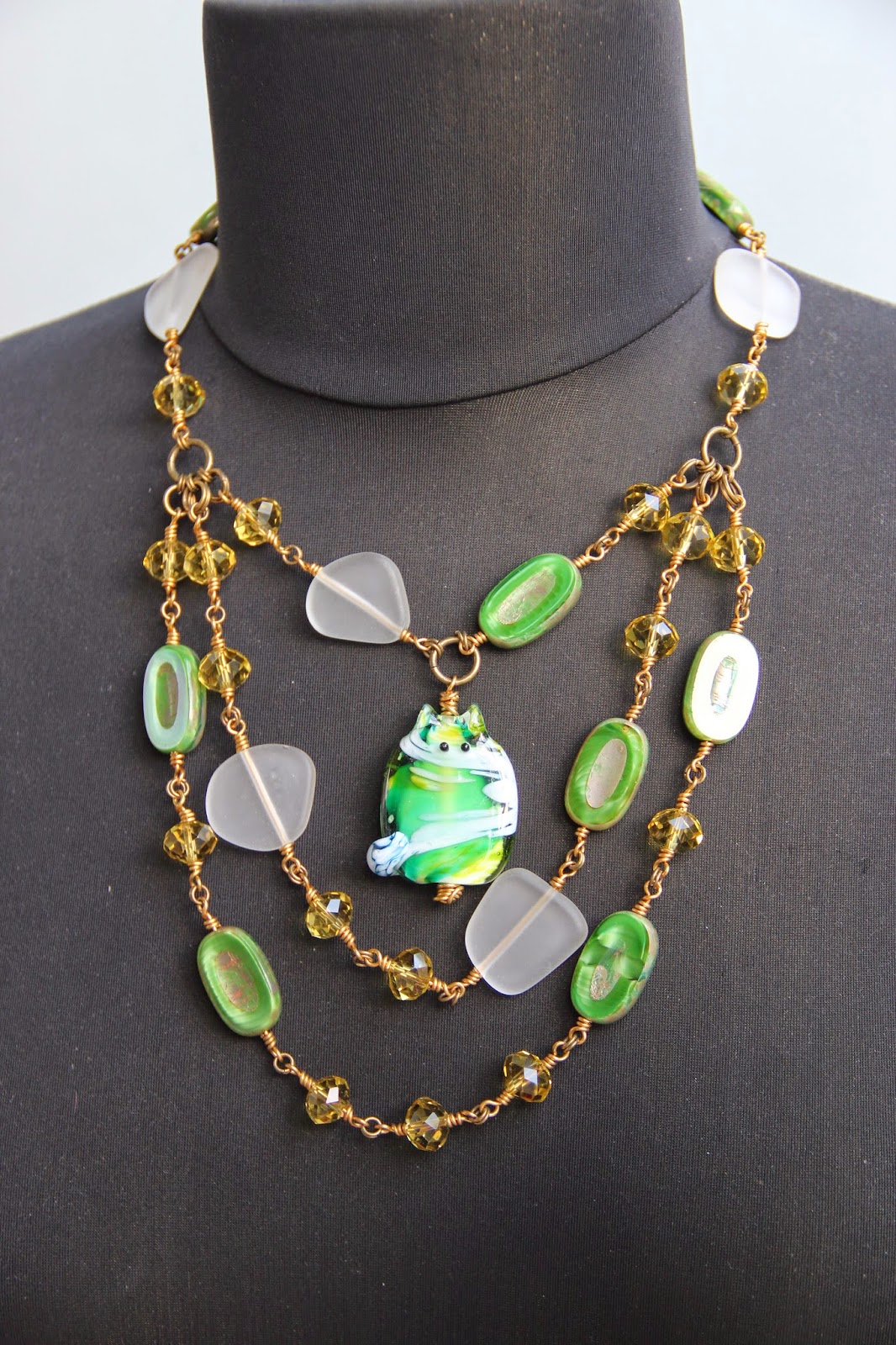 Plus de bleu, mais il me reste le jaune pâle et le transparent mat. Là, j’ai pioché dans mes perles pour un collier multirangs avec des perles vertes et une perle chat artisanal de