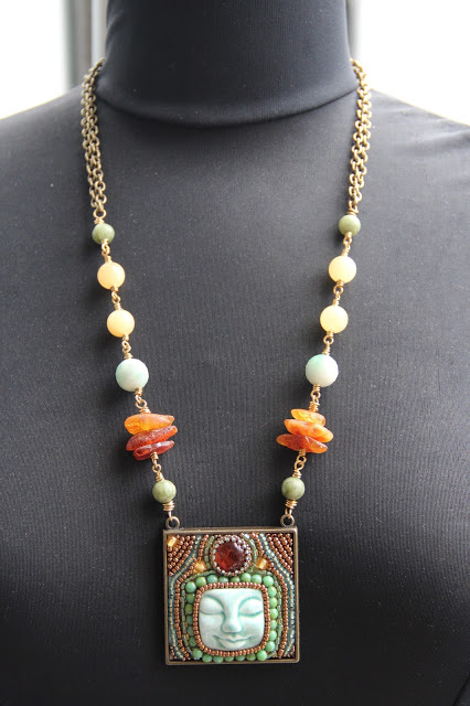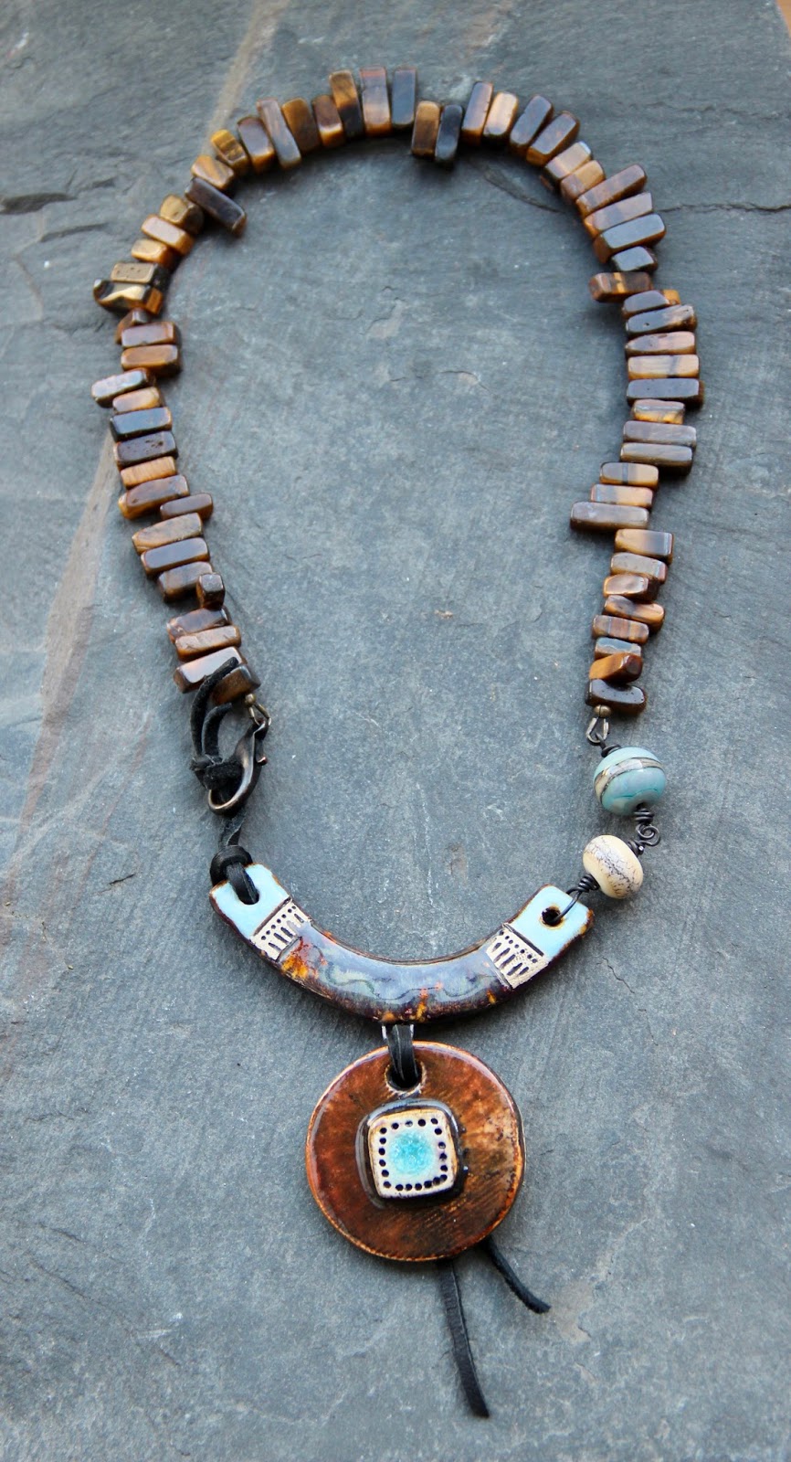 To start, I made a necklace that came to me without me knowing. I was looking through Happy Fish pendants  and decided that two of them matched each other perfectly. Then came the tiger eye beads, perfect match in color and the Glass Bead Art beads. It took me a few more days to finish it, with some suede lace.