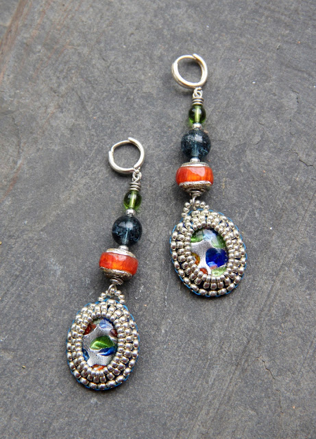 A couple pair of earrings and an embroidered pendant I finally made into a necklace.