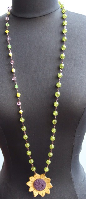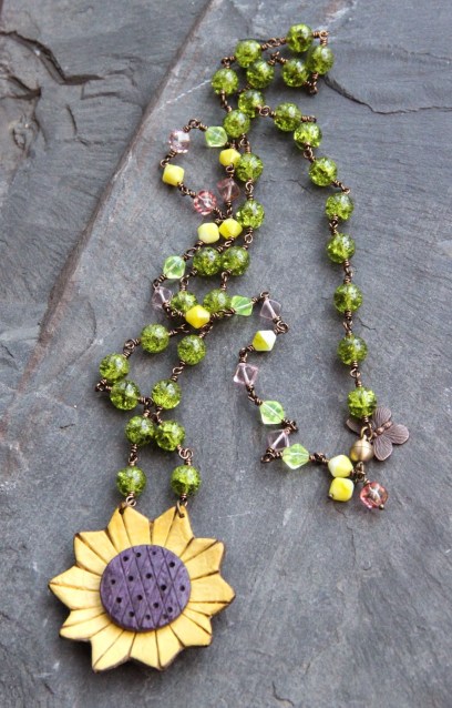 Tout d’abord un coeur, un coeur certes mais rouge, jaune et orange. J’y ai ajouté un oiseau de Pips Jewellery, une perle en cuivre et des coupelles de Lorelei Eurto Jewelry , des perles en bambou corail et des chips de pierre teintée.