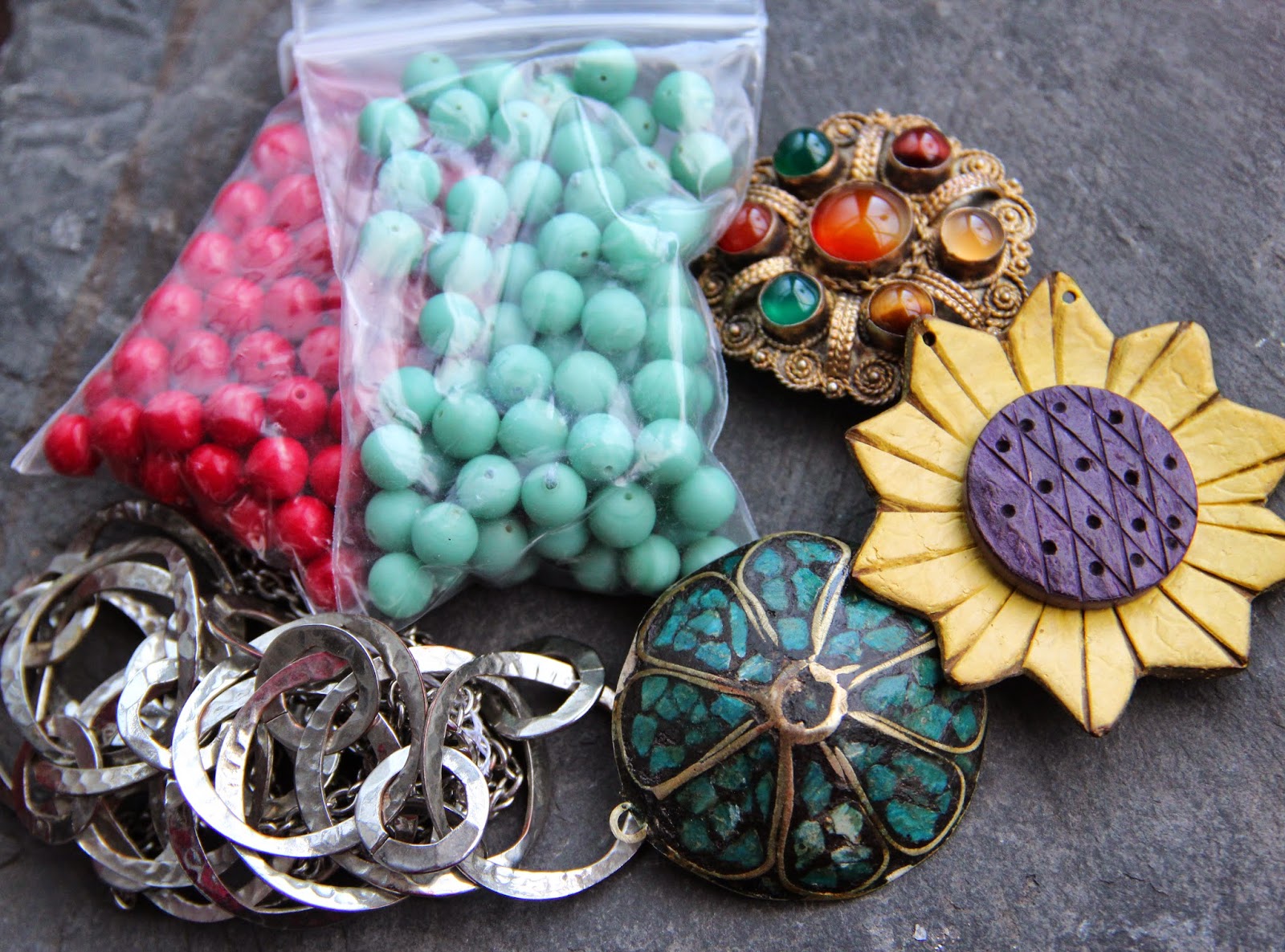 First I chose a heart, a heart yes but red, orange and yellow. I added a Pips Jewellery bird, a copper bead, some tin bead caps from Lorelei Eurto Jewelry, coral bamboo and tainted stone chips.
