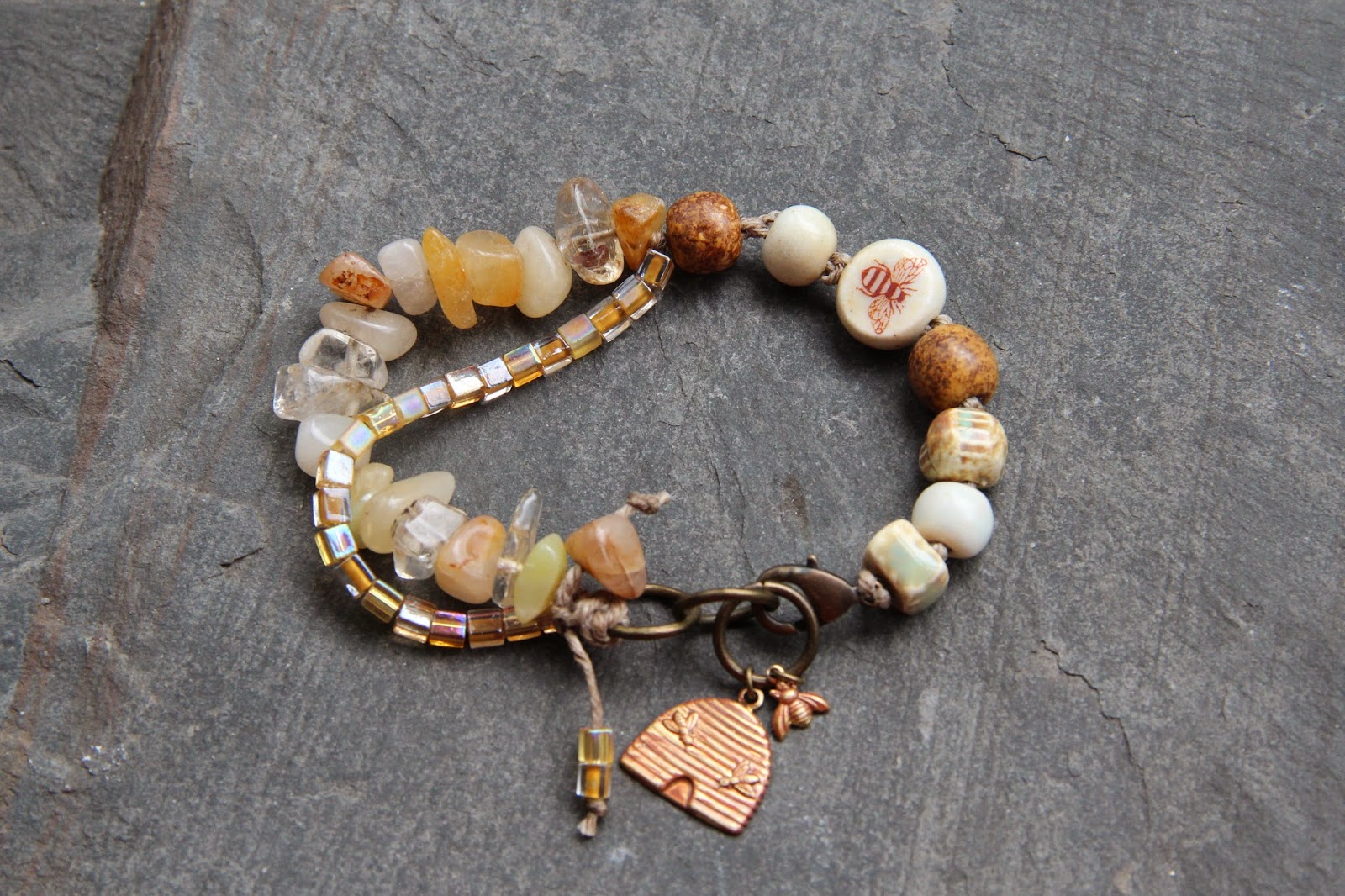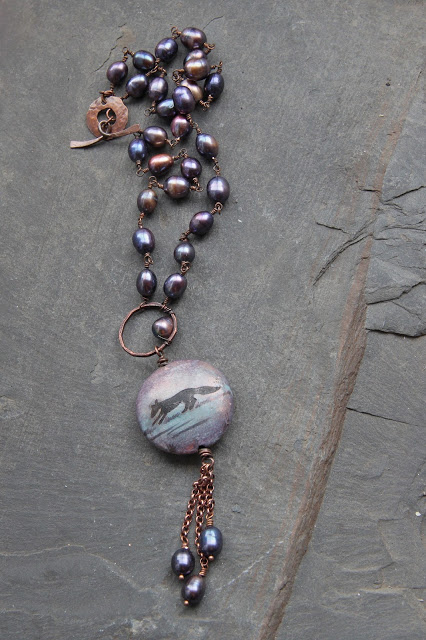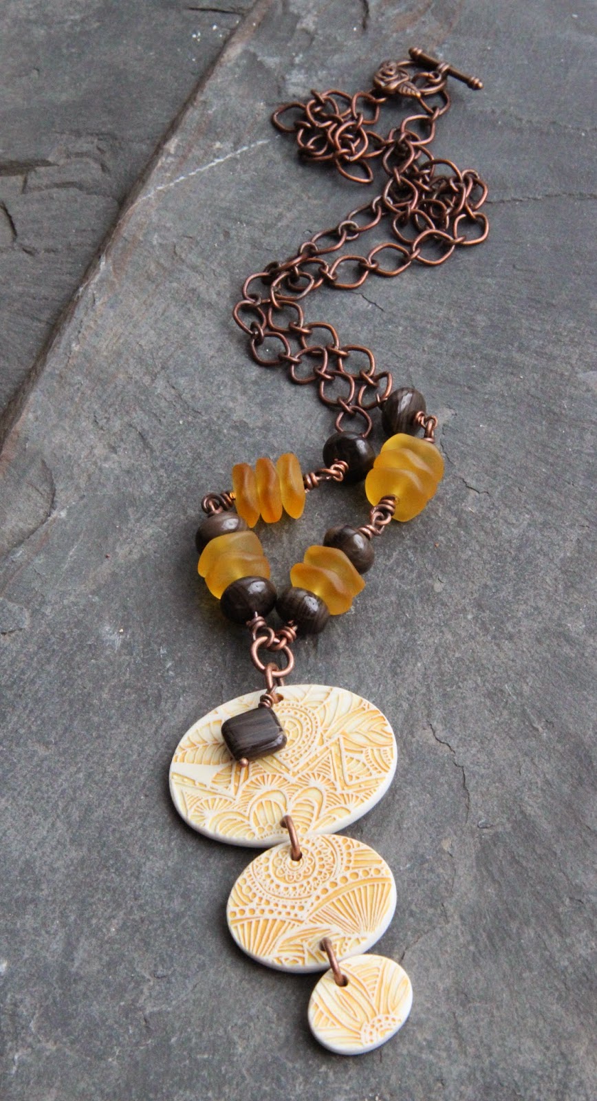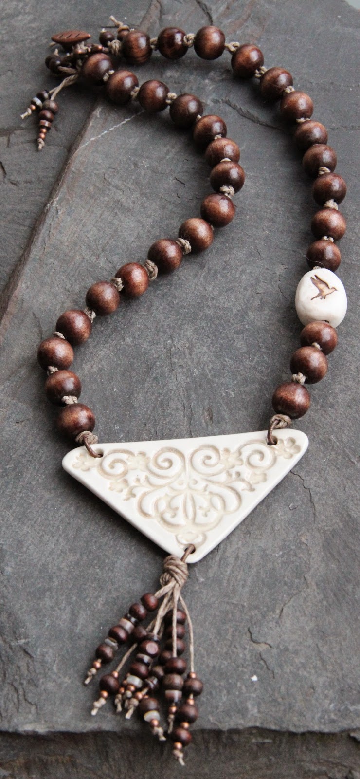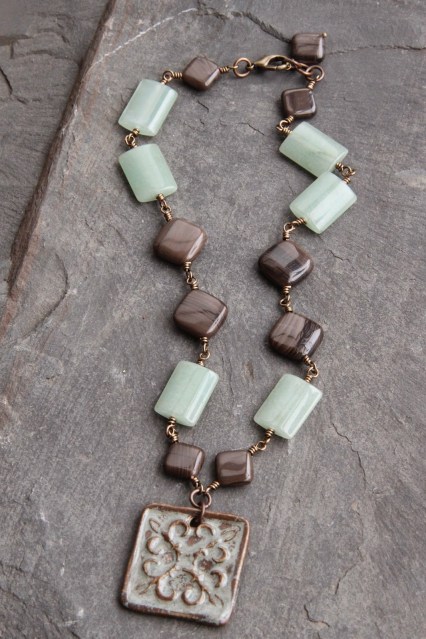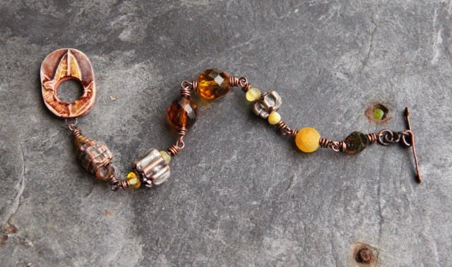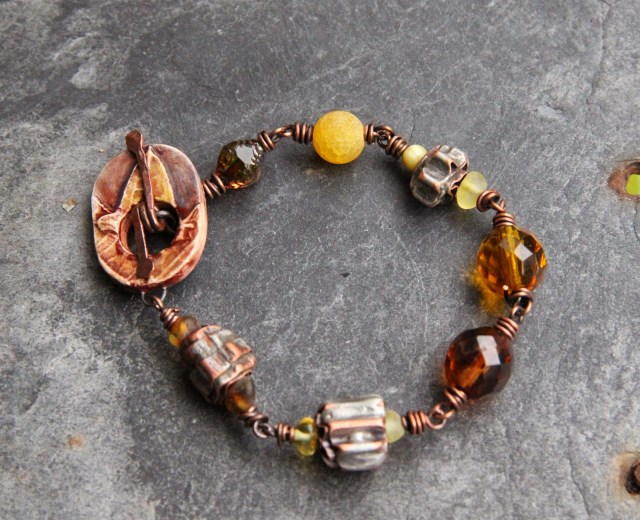 I chose beads and a toggle clasp by Mary Harding, one of my favorite artist. In her work I can see, noble materials, patience, nature and love. I don’t know if I created something worth of them but I tried to put myself in it too. I didn’t use any ready made wire or jump rings, I formed, oxidized and polished them myself from copper wire.