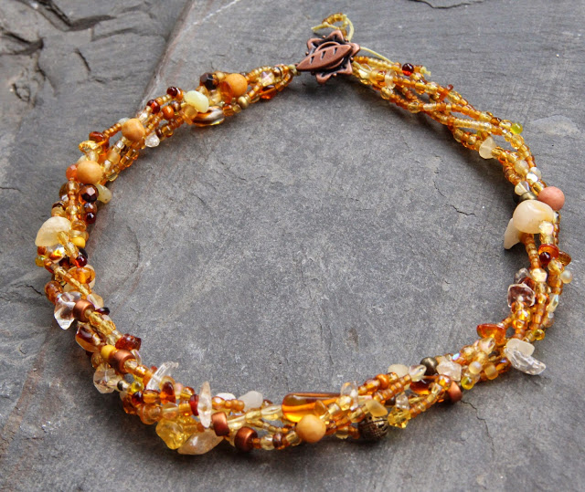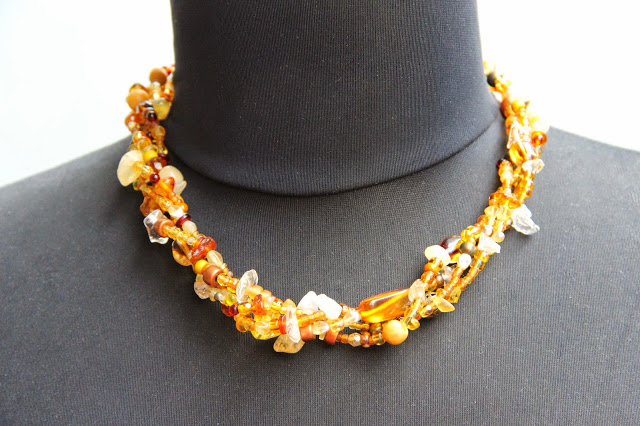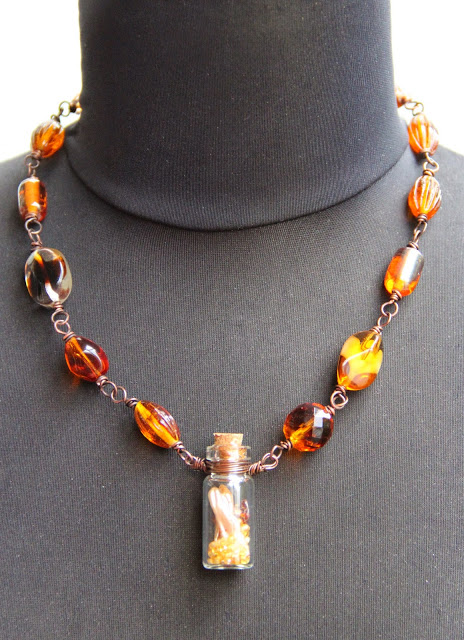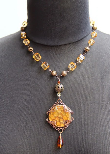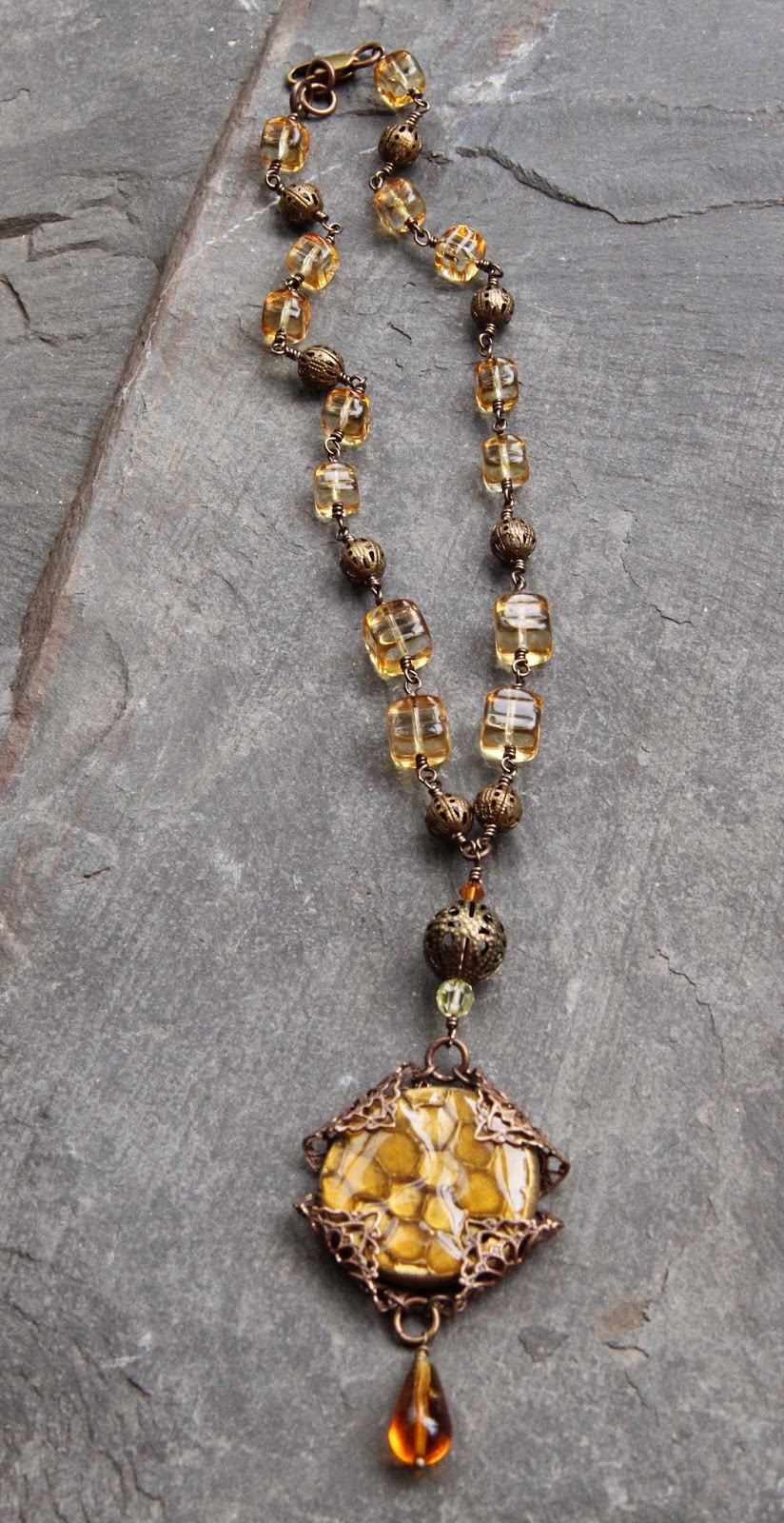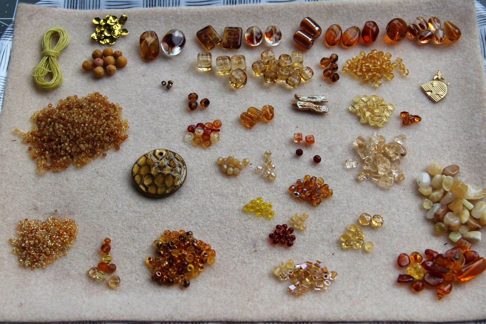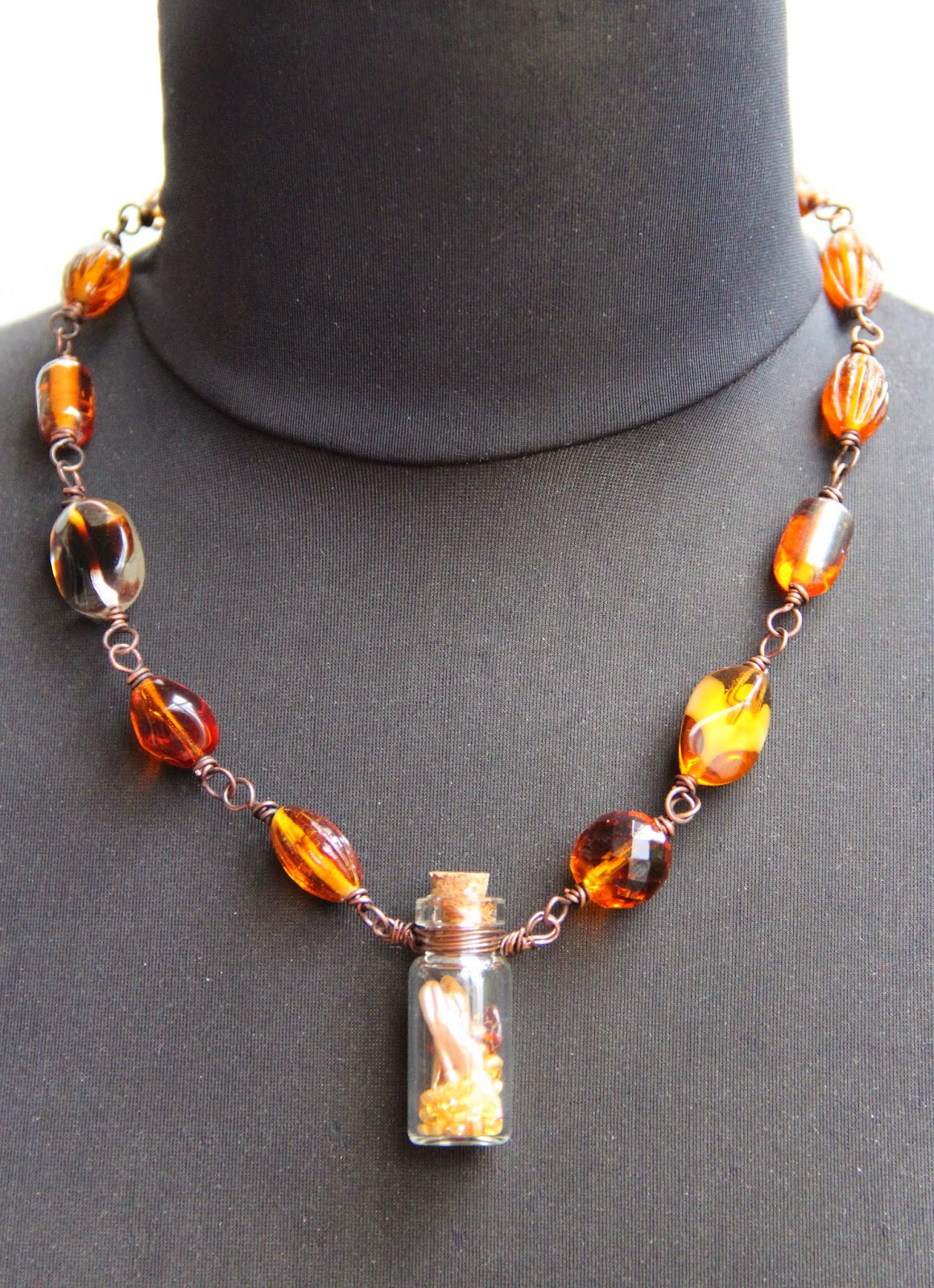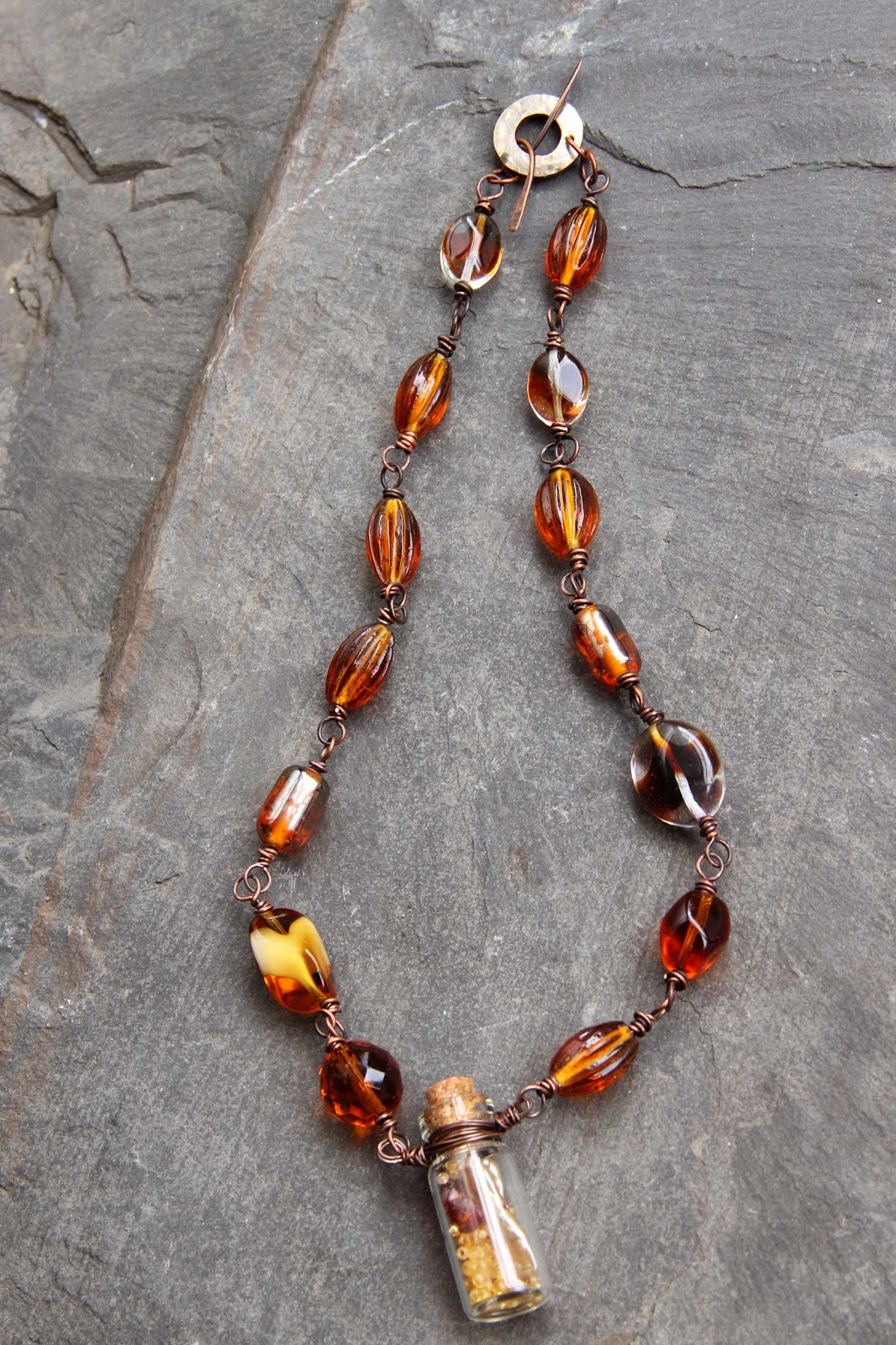 J’ai ajouté de l’ambre, une agate et deux perles en verre de Bohême.