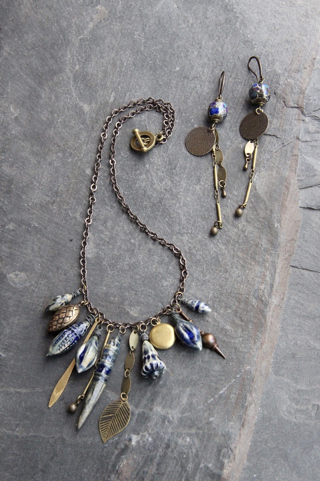 Je cherche donc d’autres perles à associer. Et je fais une pause, je regarde les photos prises en Irlande, l’une d’entre elles me fait penser à d’autres pendentifs de Scorched Earth que je venais de voir et voilà comment je suis passée de la recherche d’inspiration à deux paires de boucles d’oreille.