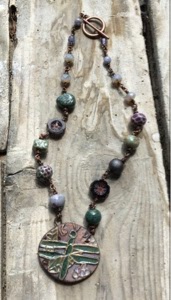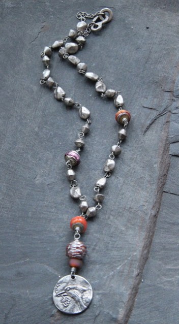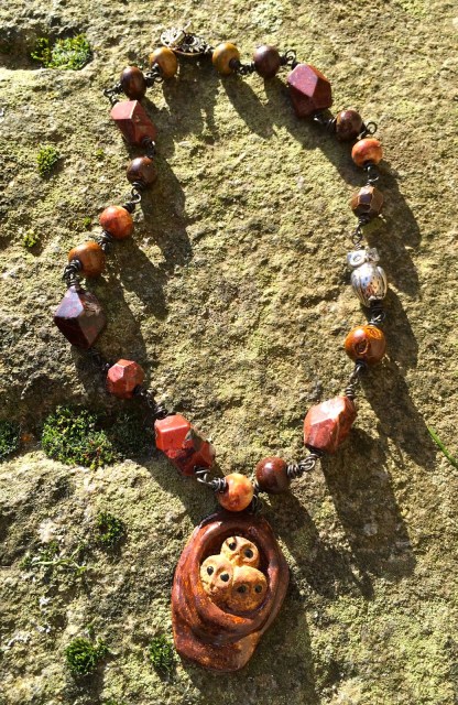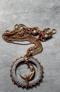Un début. J’avais envie d’un peu plus, alors j’ai pensé feutrage à l’aiguille, mais le temps de m’y remettre… une autre fois. Puis j’ai pensé aux tentacules, et dans les perles , j ai trouvé de quoi faire un pendentif, que je n’ai pas encore monté en collier mais presque,