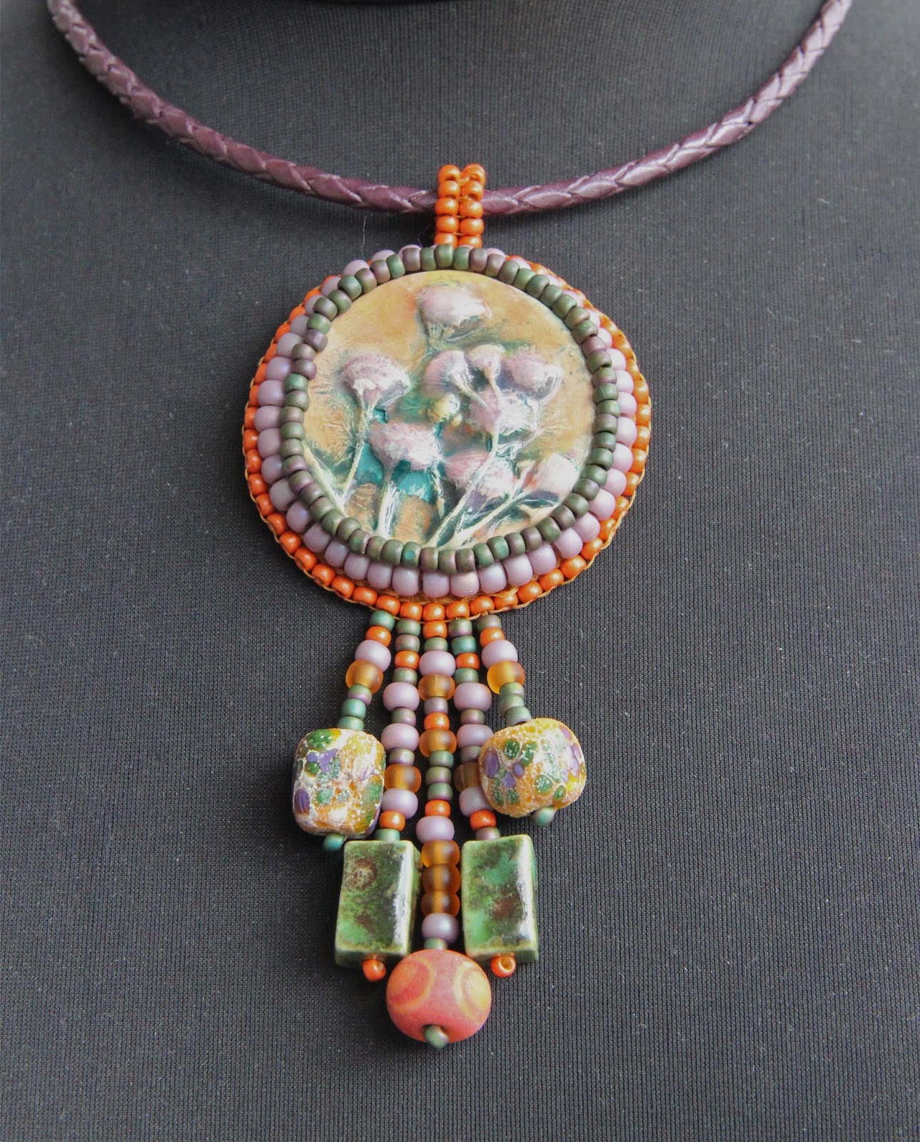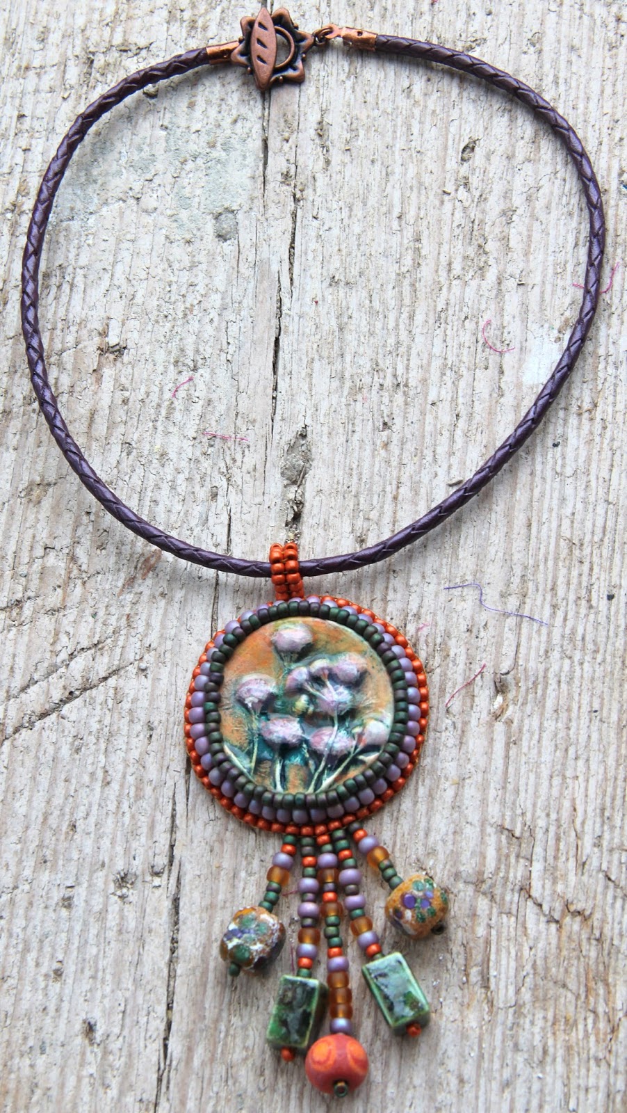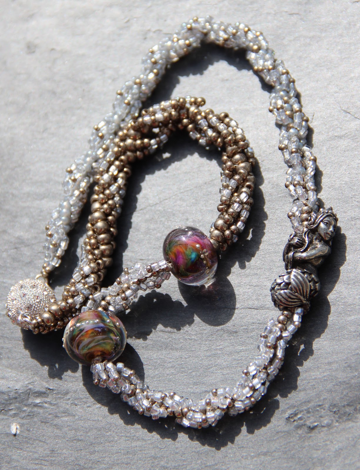 Un début. J’avais envie d’un peu plus, alors j’ai pensé feutrage à l’aiguille, mais le temps de m’y remettre… une autre fois. Puis j’ai pensé aux tentacules, et dans les perles , j ai trouvé de quoi faire un pendentif, que je n’ai pas encore monté en collier mais presque,