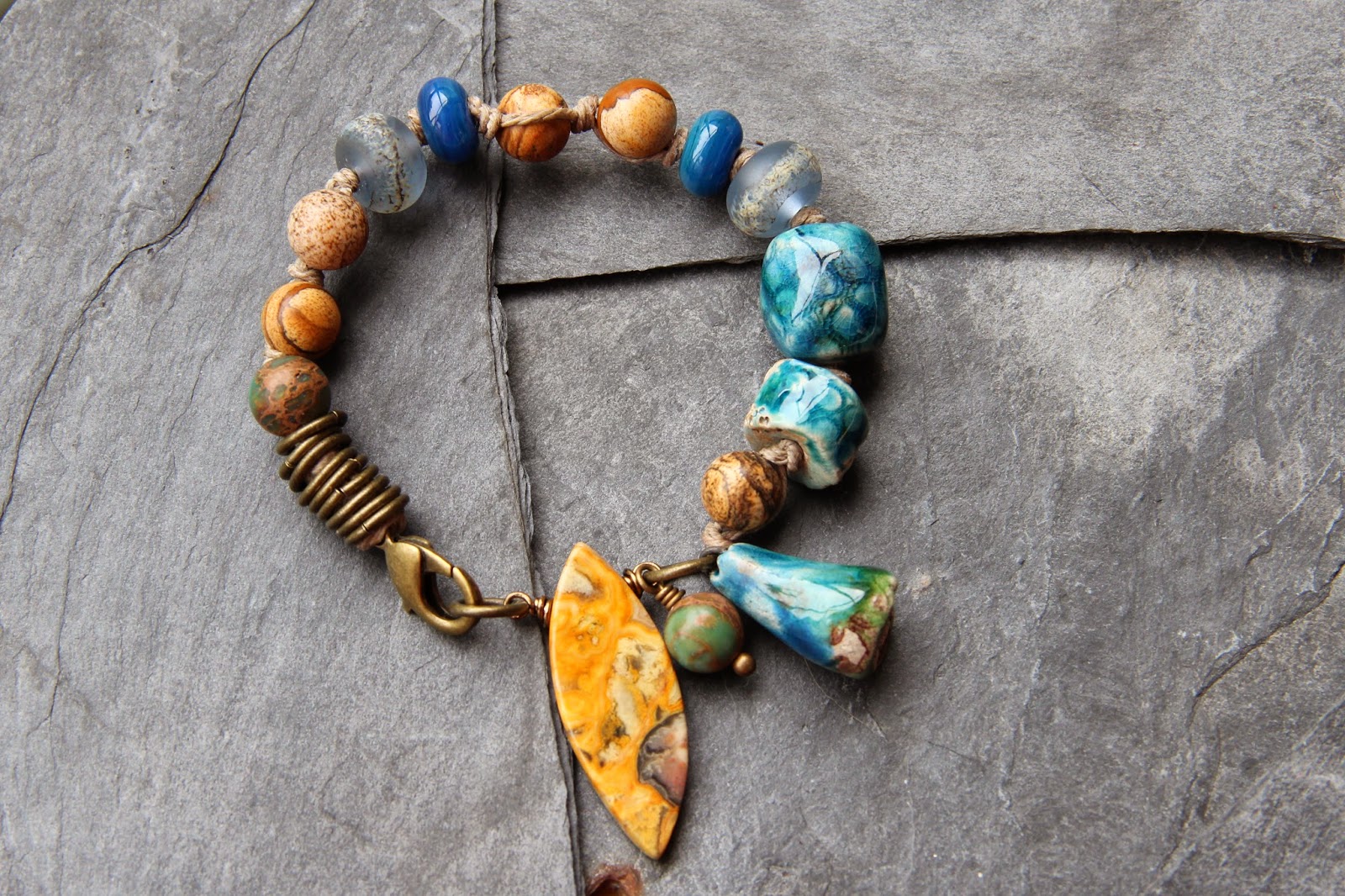 From left to right, a turquoise bead, a wooden bead, a NKP Designs bead from Ann Schroeder’s giveaway on her blog Bead love, an African glass bead from Ahowin, a wooden bead, an African bronze bead, a wooden bead, another bead from Ahowin and a ceramic bead from Happy Fallout.